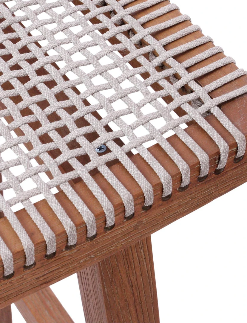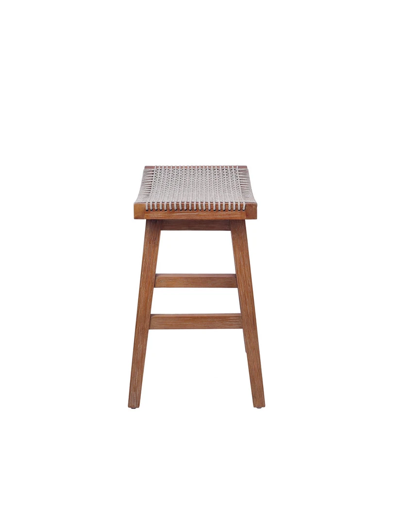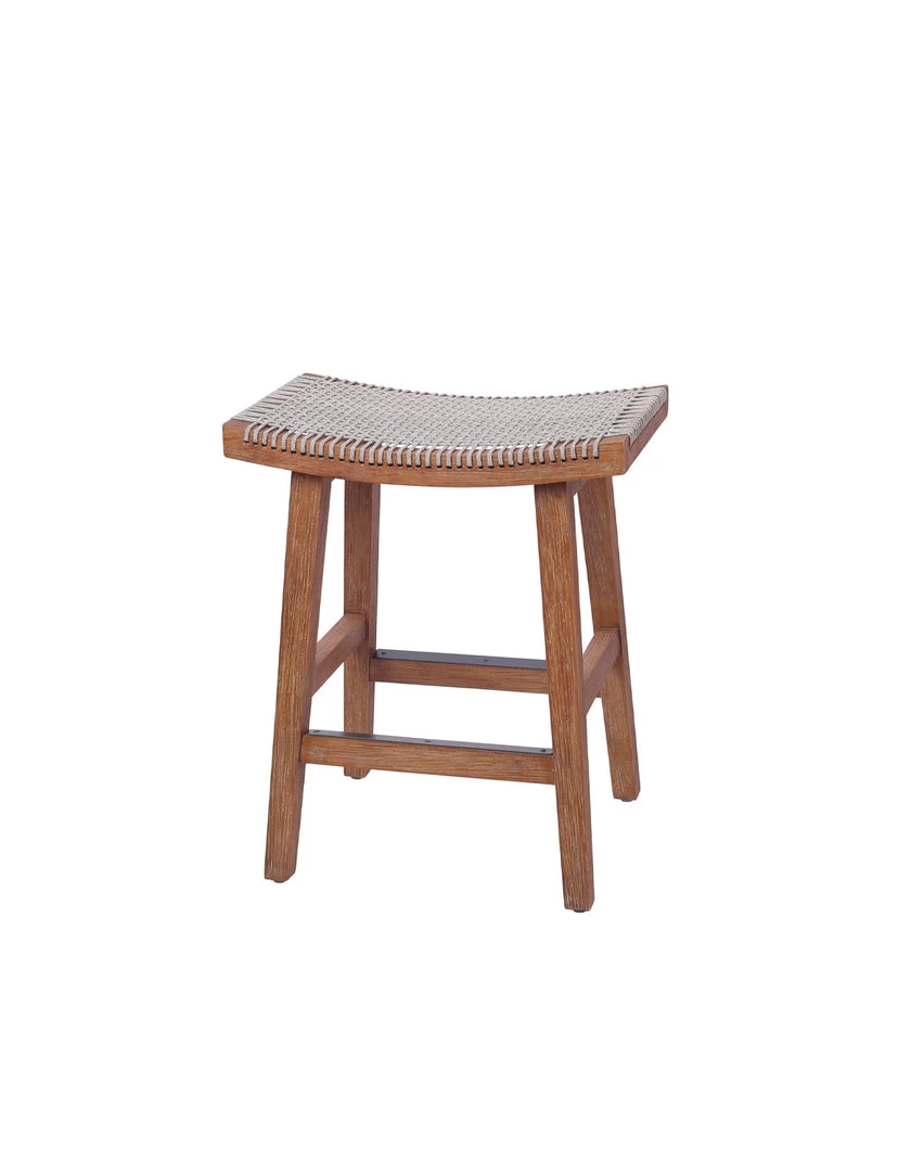 Saddle seat profile in 26″ counter height is constructed of charming interwoven rope pattern in Gray tone, paired with solid Mahogany legs in Brown; creating a modern appeal that’s timeless and elegant in the dining or breakfast bar space. Stretcher base provides stability and strength.
