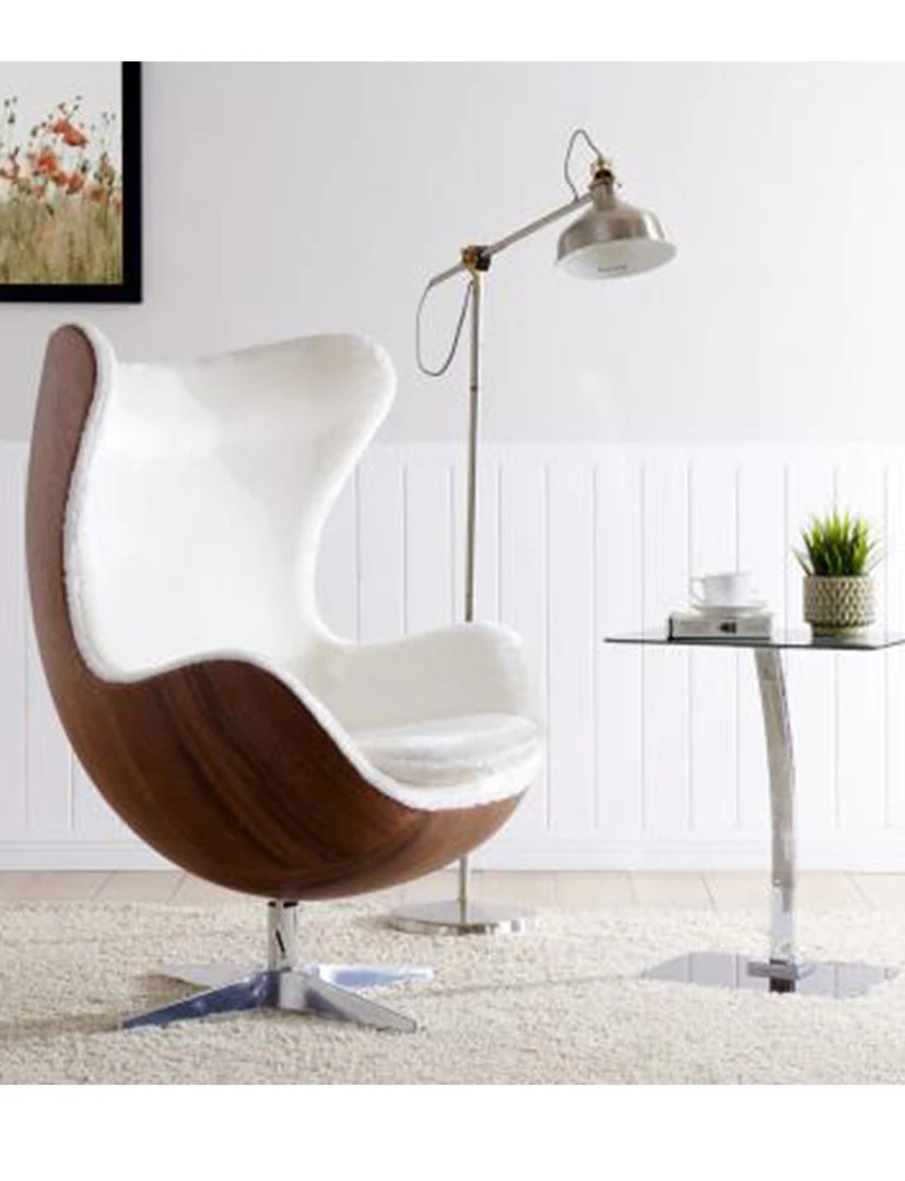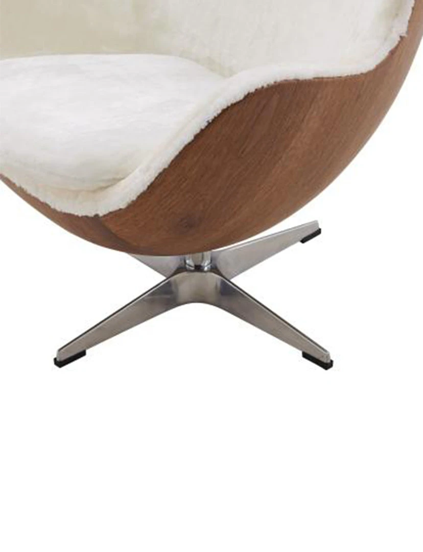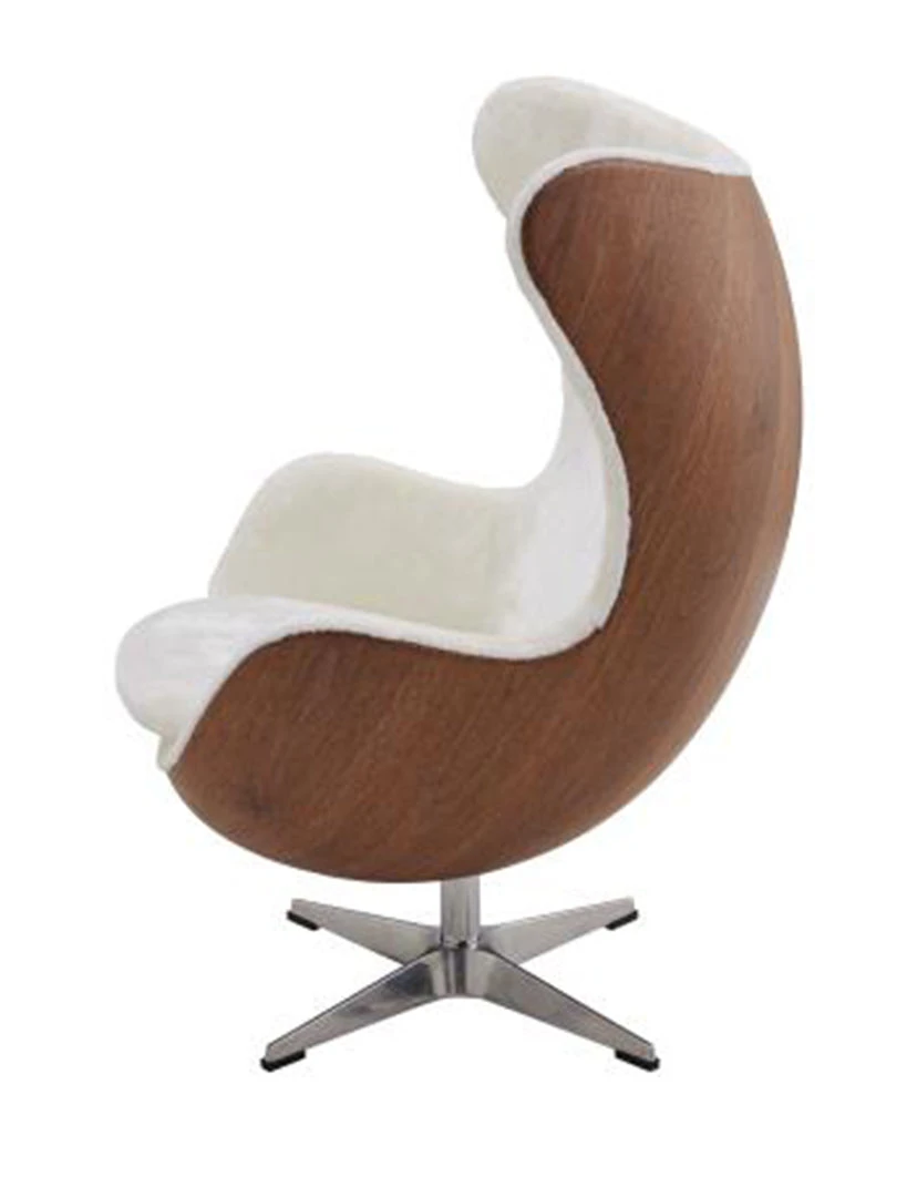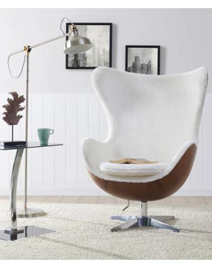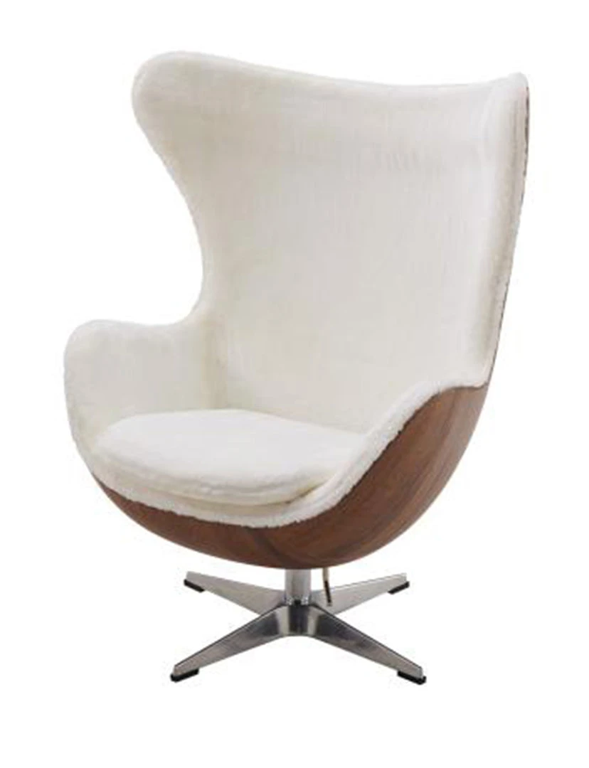 - Features: Mid-Century Egg style lounge chair that fits well in a man-cave or stylish living room or office setting. Soft faux fur upholstery in White is contrasted beautifully with Walnut color frame. Includes lever handle for rock + tilt functions. Sleek and striking, this will surely make a conversation piece.