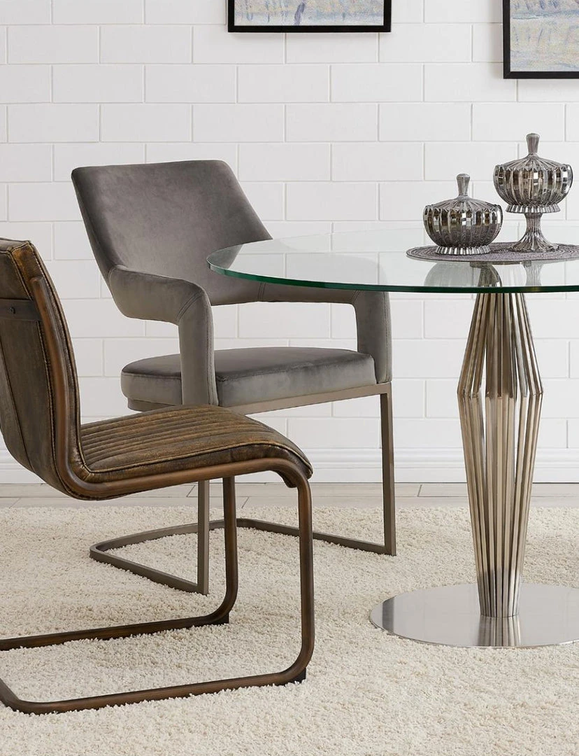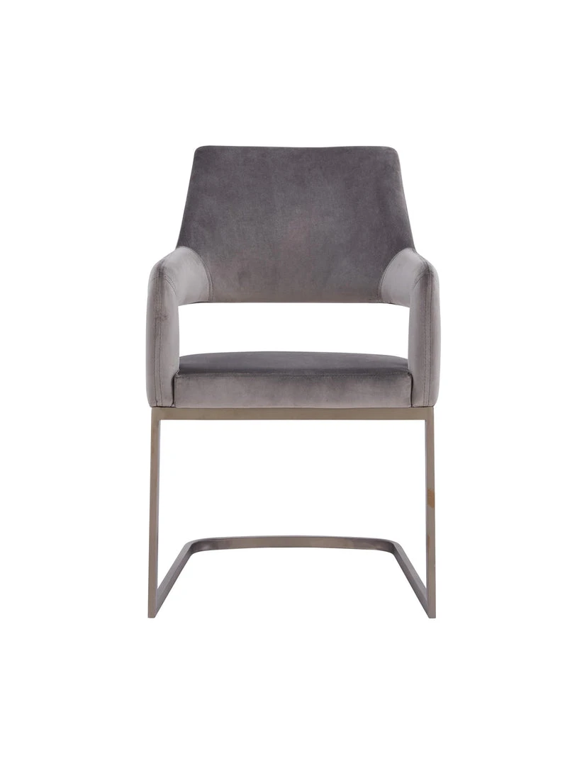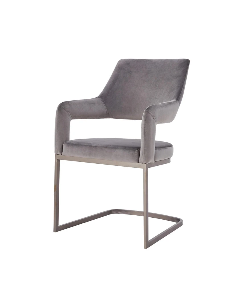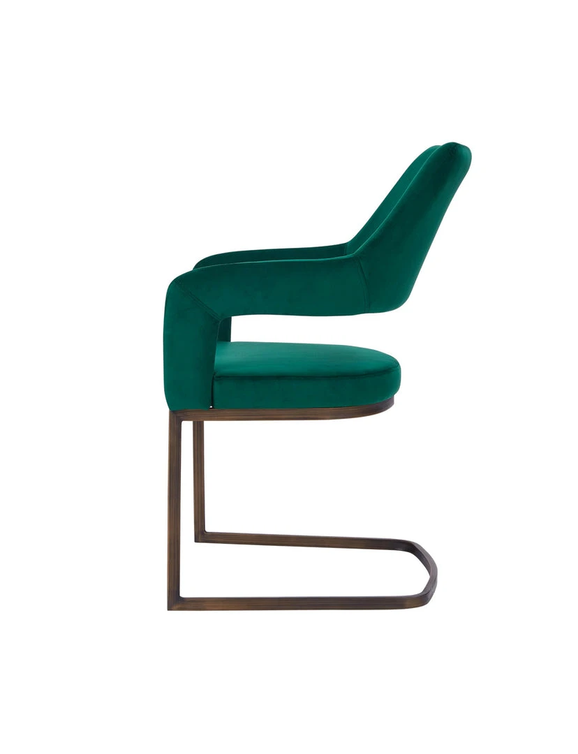 Modern Rachel dining chair with desirable features such as sleek open back profile with soft velvet upholstery in charming tones that’s contrasted on chic cantilever frame in silver/brass finish.