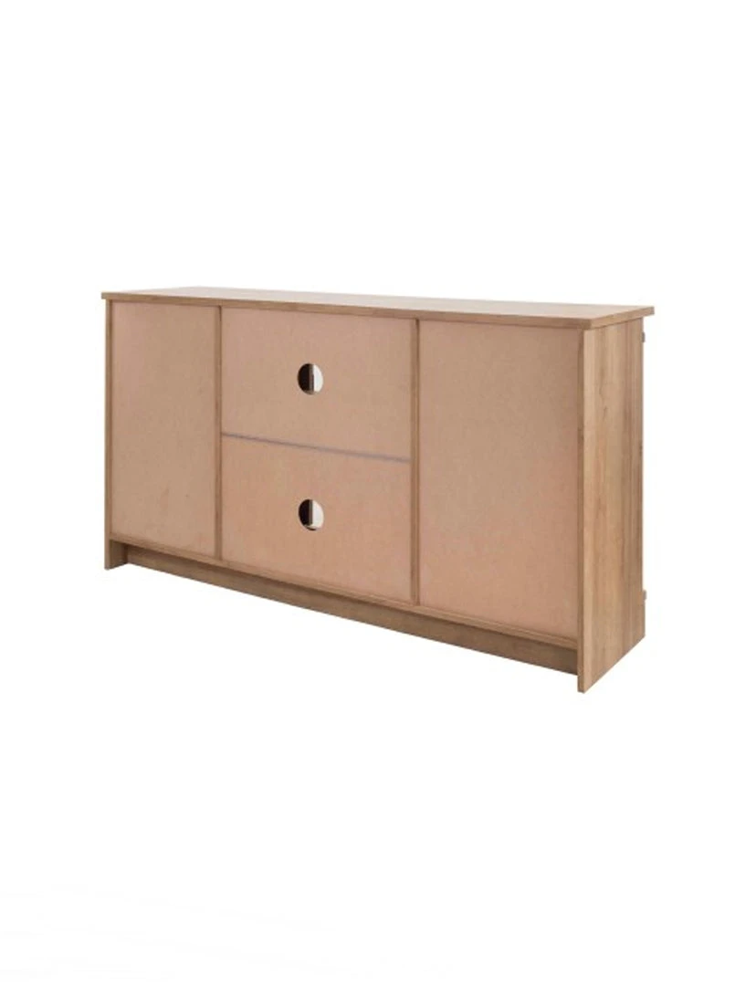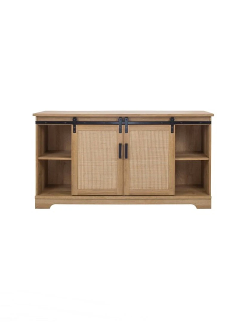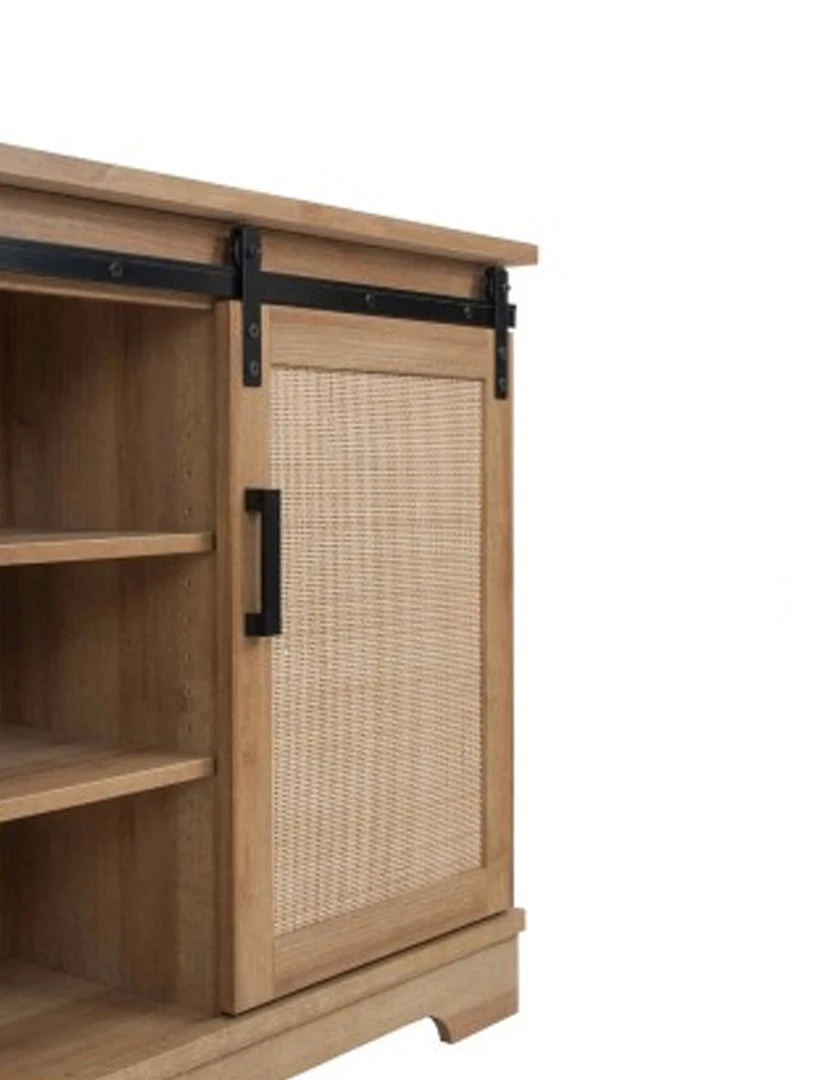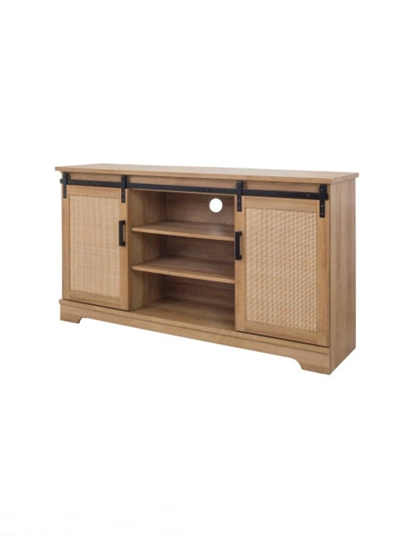 Charming Media Center features powder coated steel modern pulls and barn style sliding door panels with two removable and adjustable internal shelves in Brown Oak finish. The bottom frame is made of solid Mahogany wood. Two cable holes on the back panel provide organization and an uncluttered appearance.
