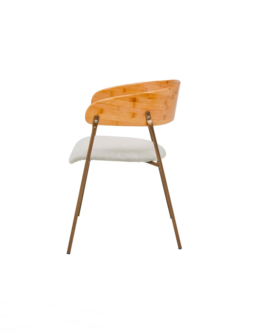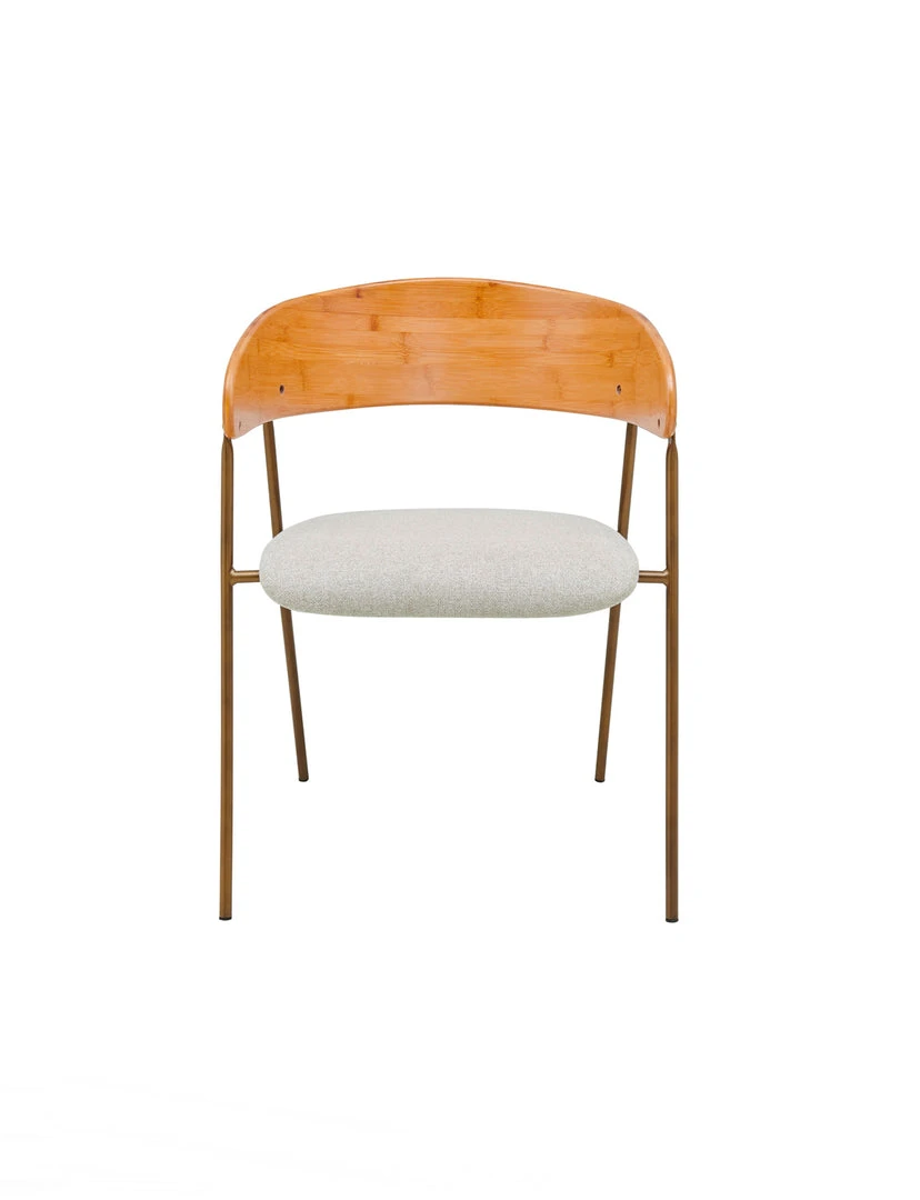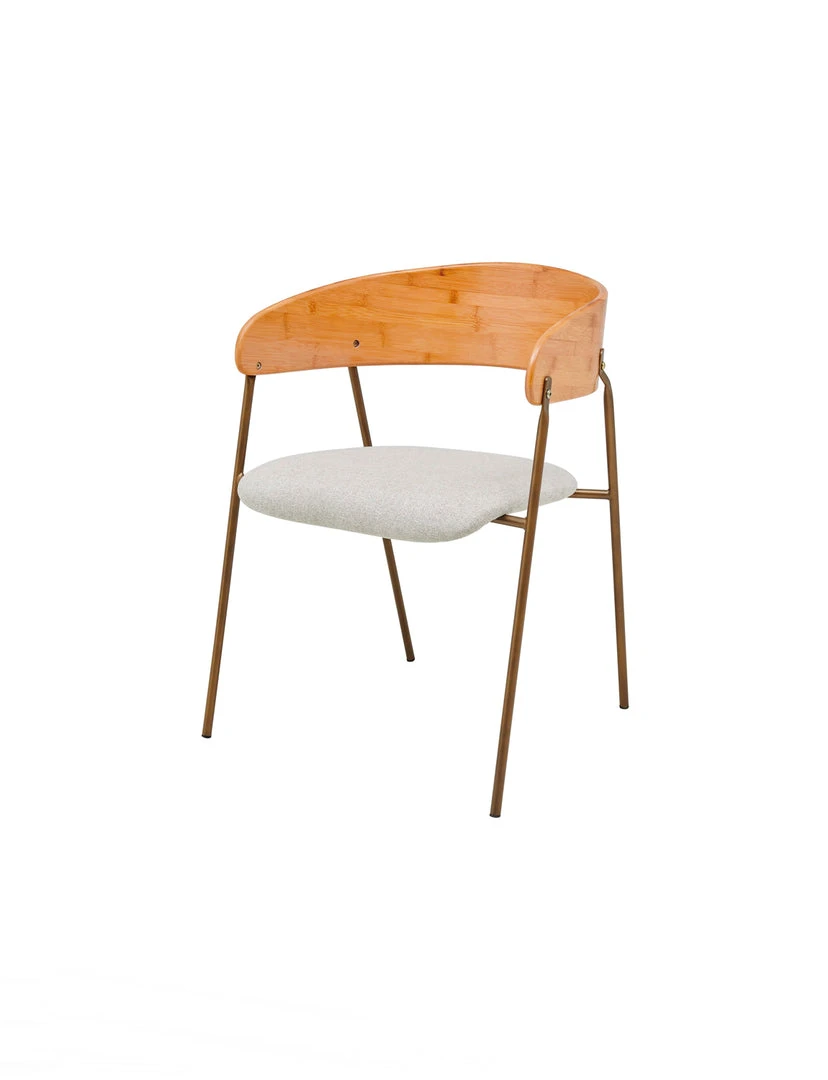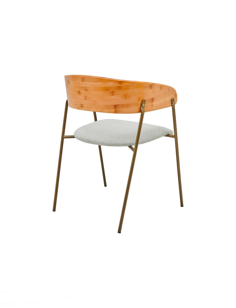 Casual & Eco-friendly style Mid-Century Hana Dining Chair, with curving bamboo back and soft linen-like fabric for the seat cushion. Sloping waterfall seat offers supportive pressure relief for the lower limbs. Legs are made of powder coated steel for sturdiness. Includes rubber level gliders for floor protection. Fixed cushion.