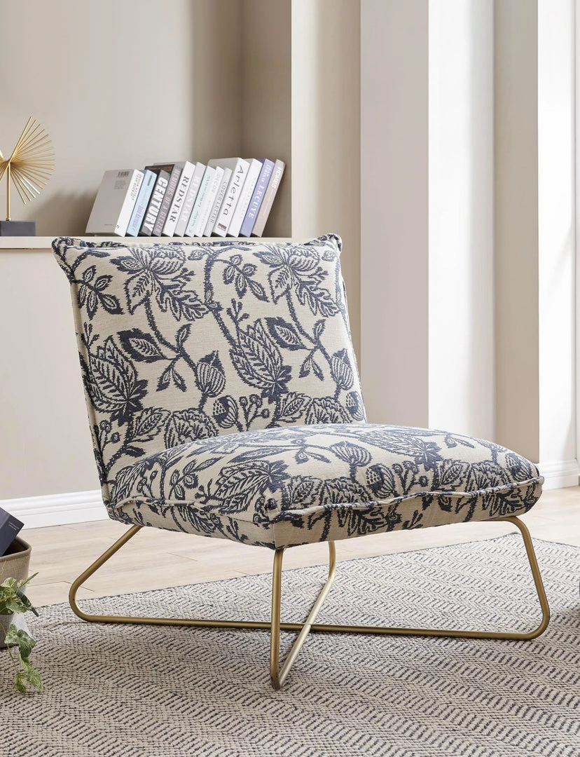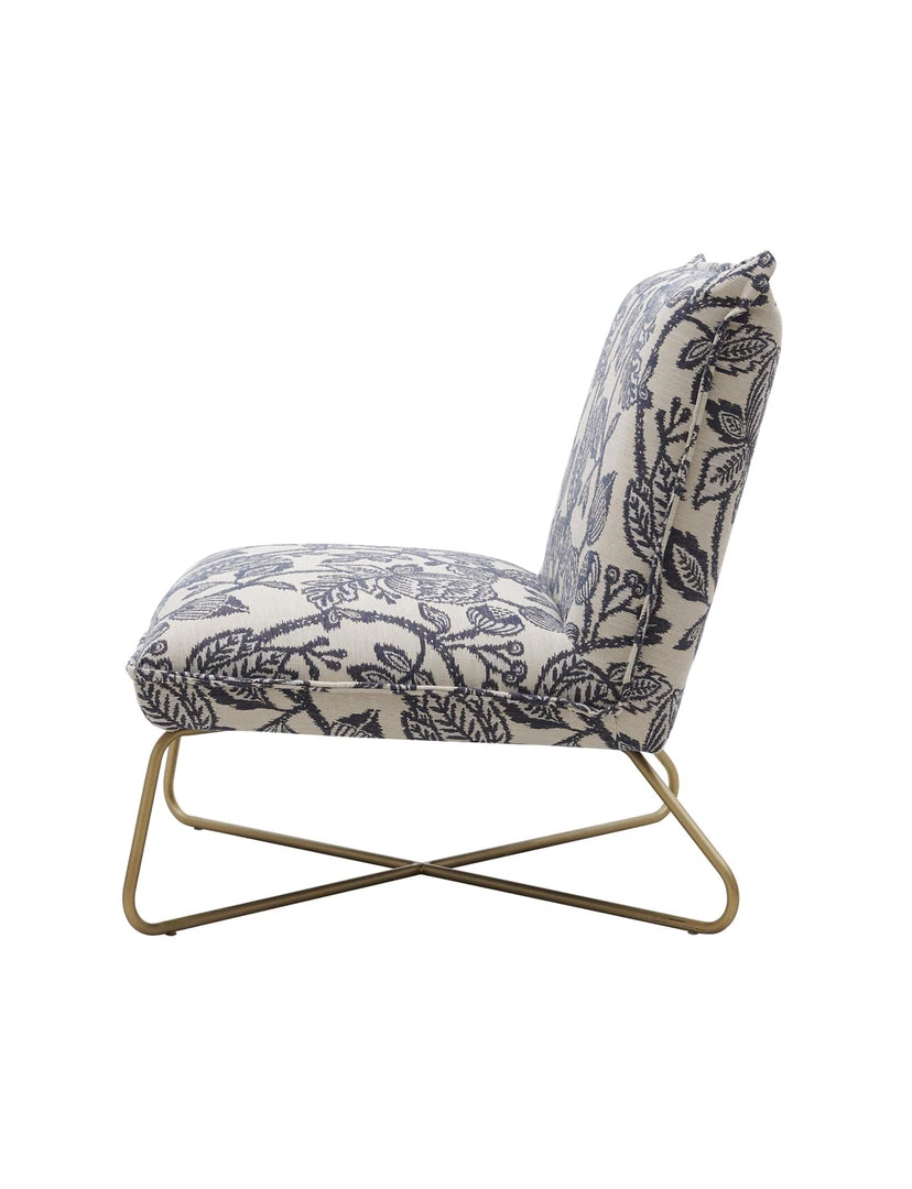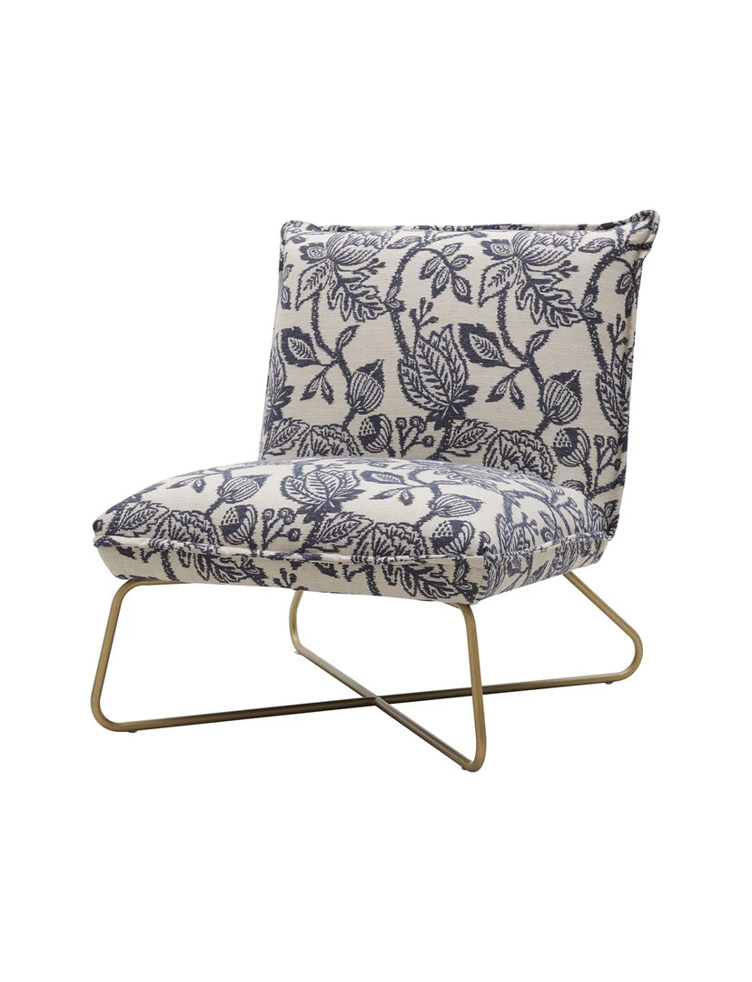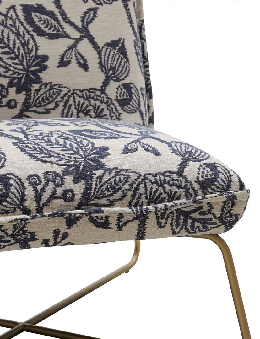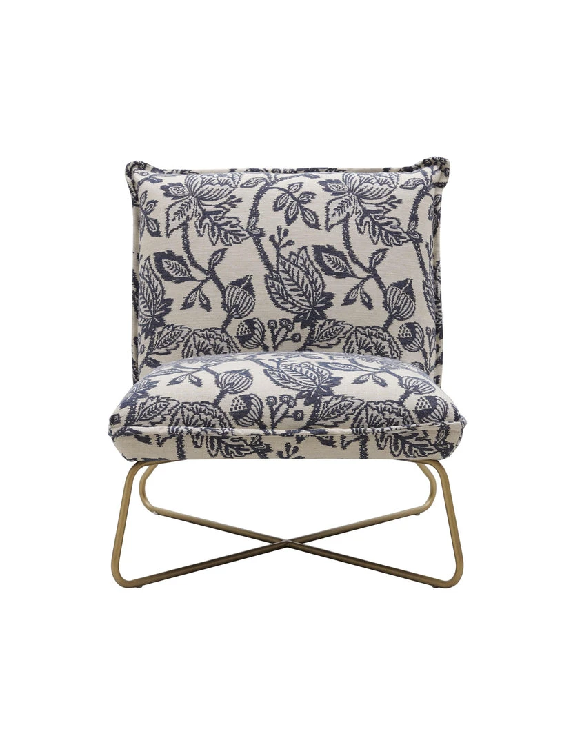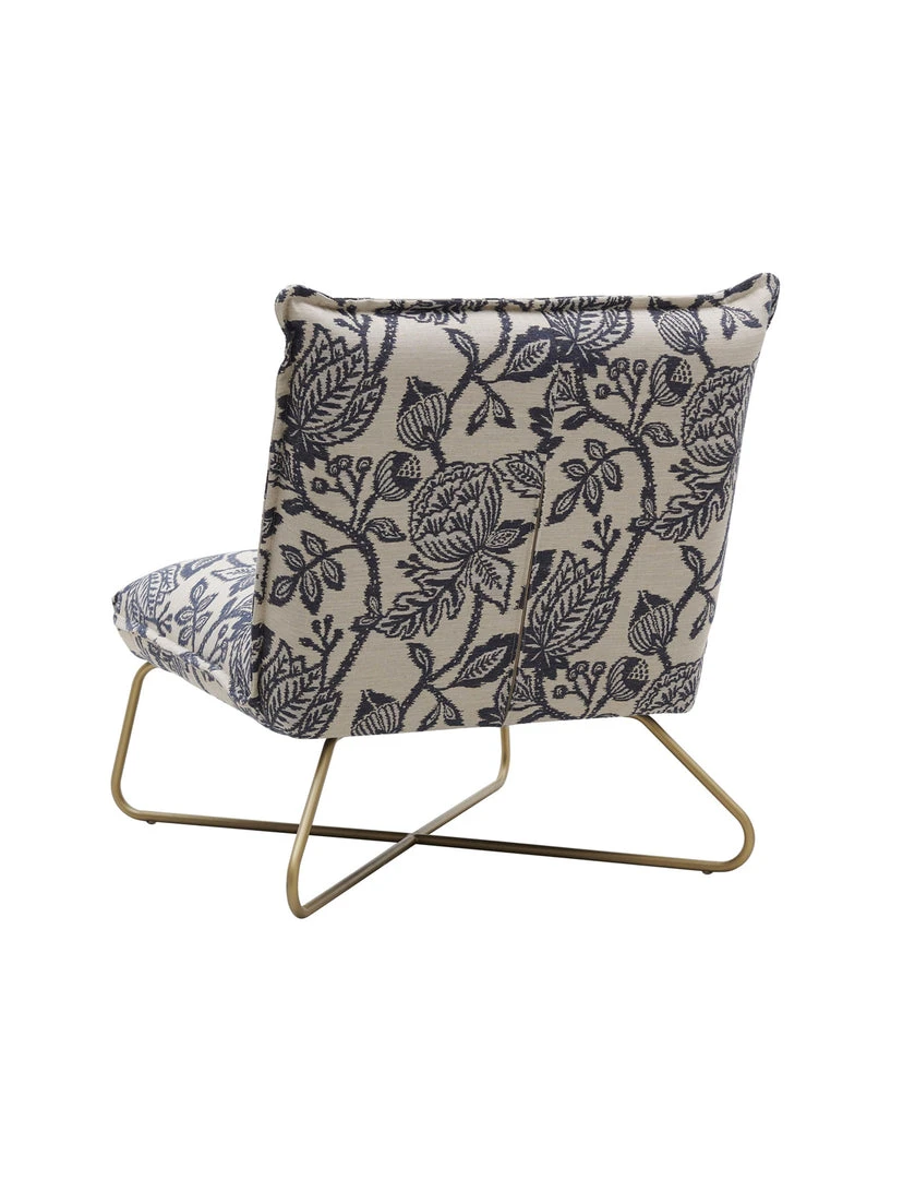 Contemporary and Casual slipper chair with delightful tropical floral tone in navy and beige. Puffy and generous seating arm chair on sleek and airy gold frame.
