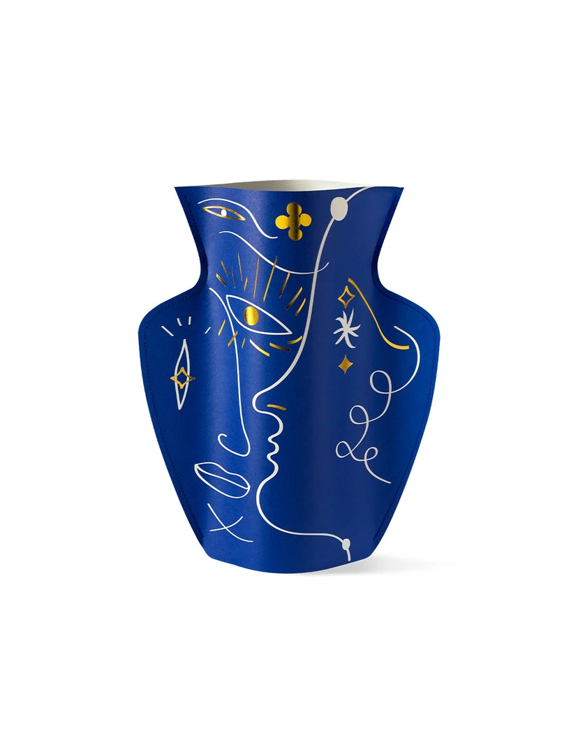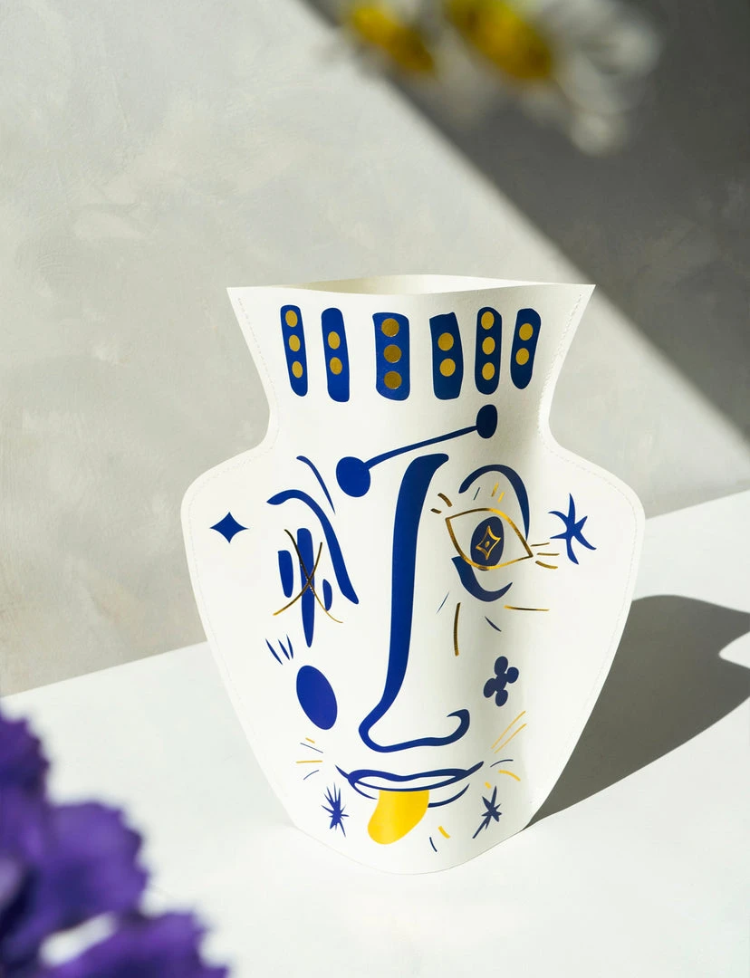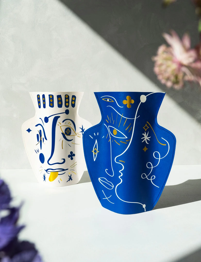 Adorned with Hayon’s characteristic line illustrations, the paper vases come in our signature shades white and blue with bold strokes in gold. As we always find great inspiration in ancient mythology, Hayon’s face drawings match perfectly with our obsession with Greek and Roman gods. The result is a superb symbiosis of both traditions.