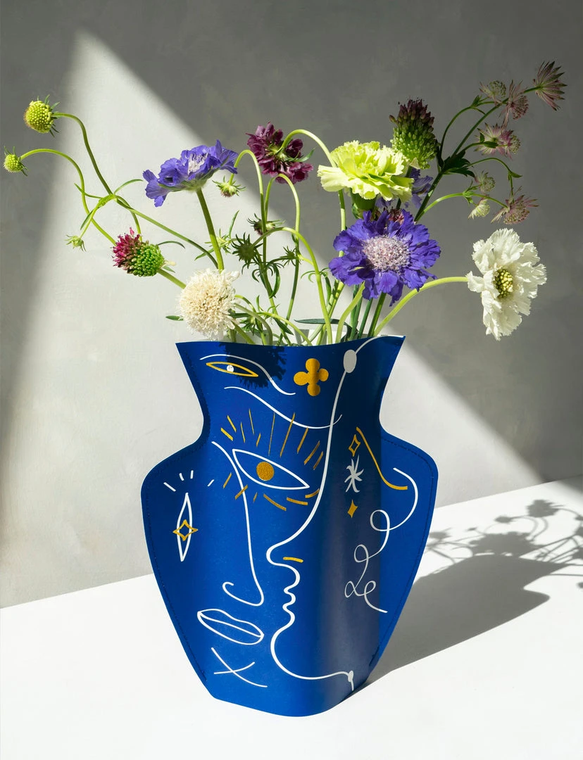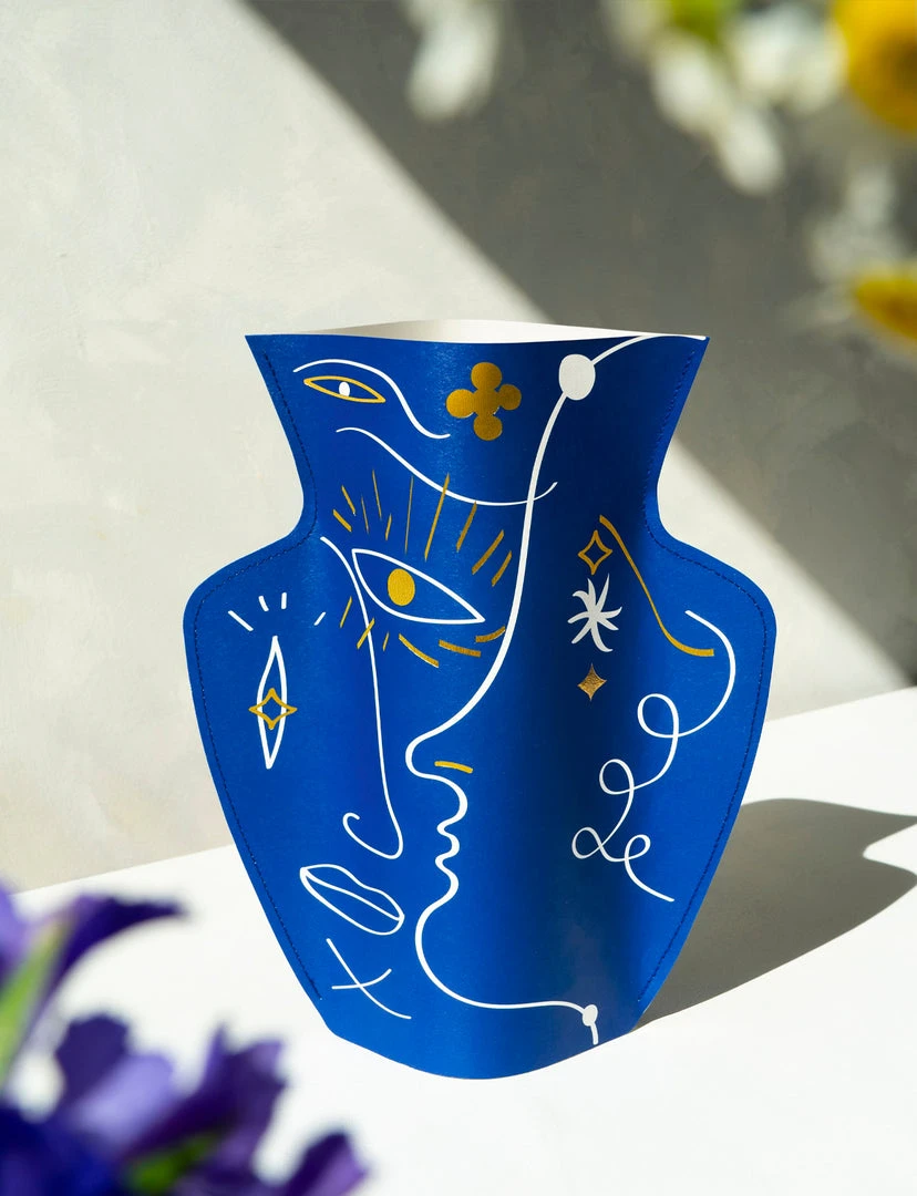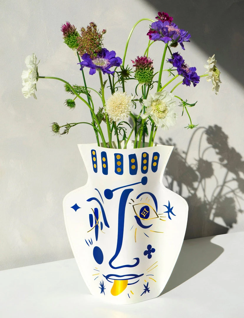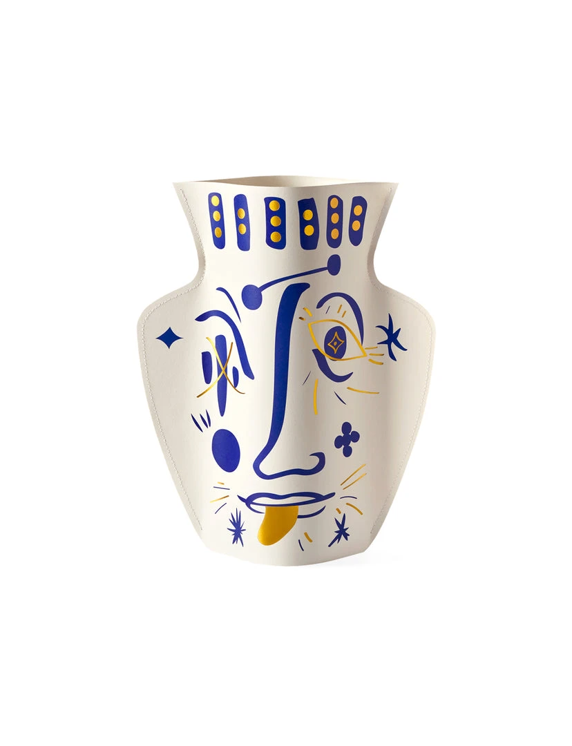 Adorned with Hayon’s characteristic line illustrations, the paper vases come in our signature shades white and blue with bold strokes in gold. As we always find great inspiration in ancient mythology, Hayon’s face drawings match perfectly with our obsession with Greek and Roman gods. The result is a superb symbiosis of both traditions.