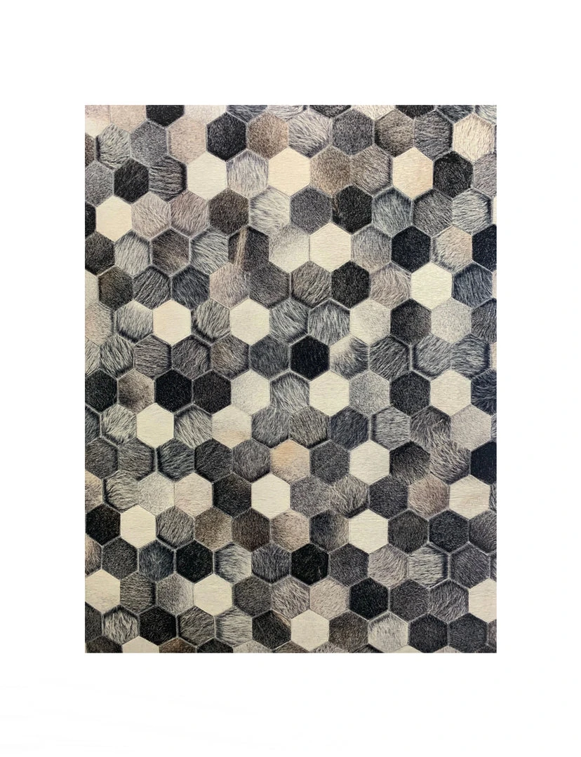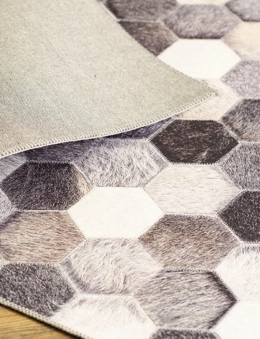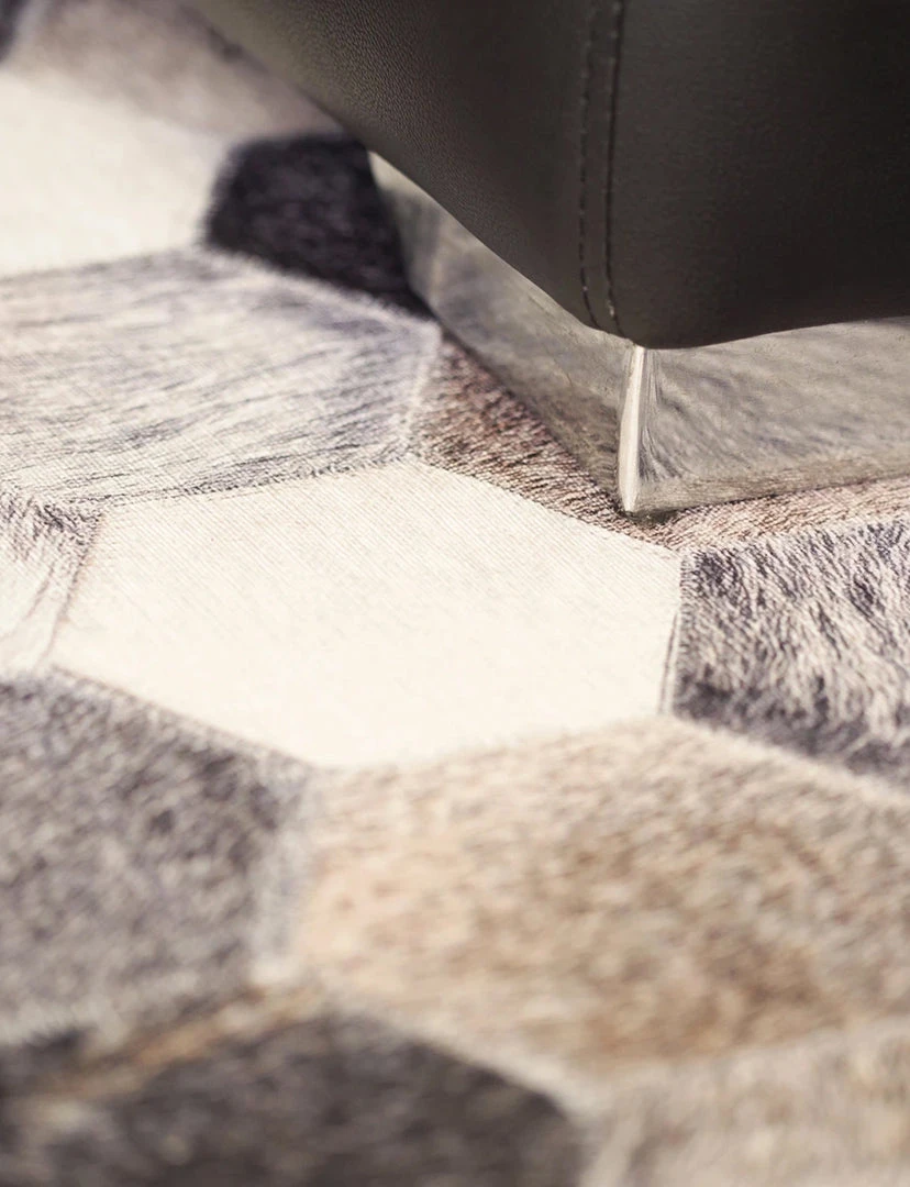 Blending rustic and contemporary elements, this vegan cowhide inspired patchwork rug anchors your arrangement with an on-trend vibe. This elegant timeless piece is made with excellent craftsmanship featuring shades of gray, beige and ivory that will compliment any decor style. This is 100% vegan.