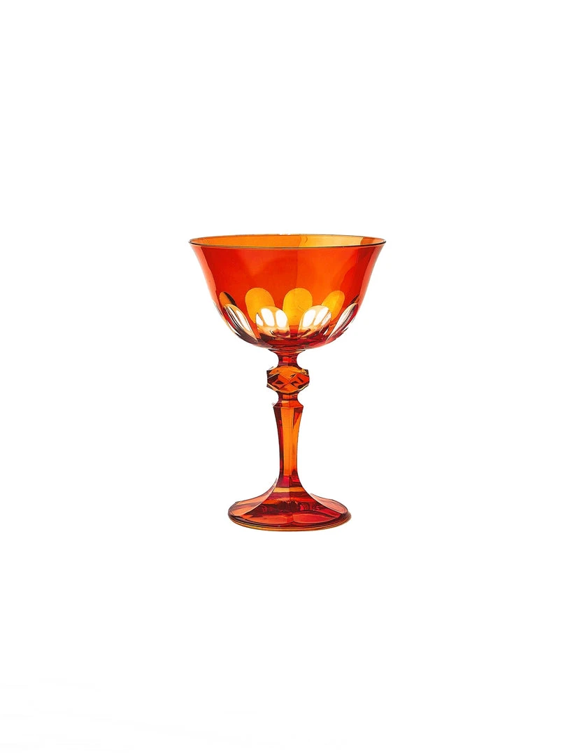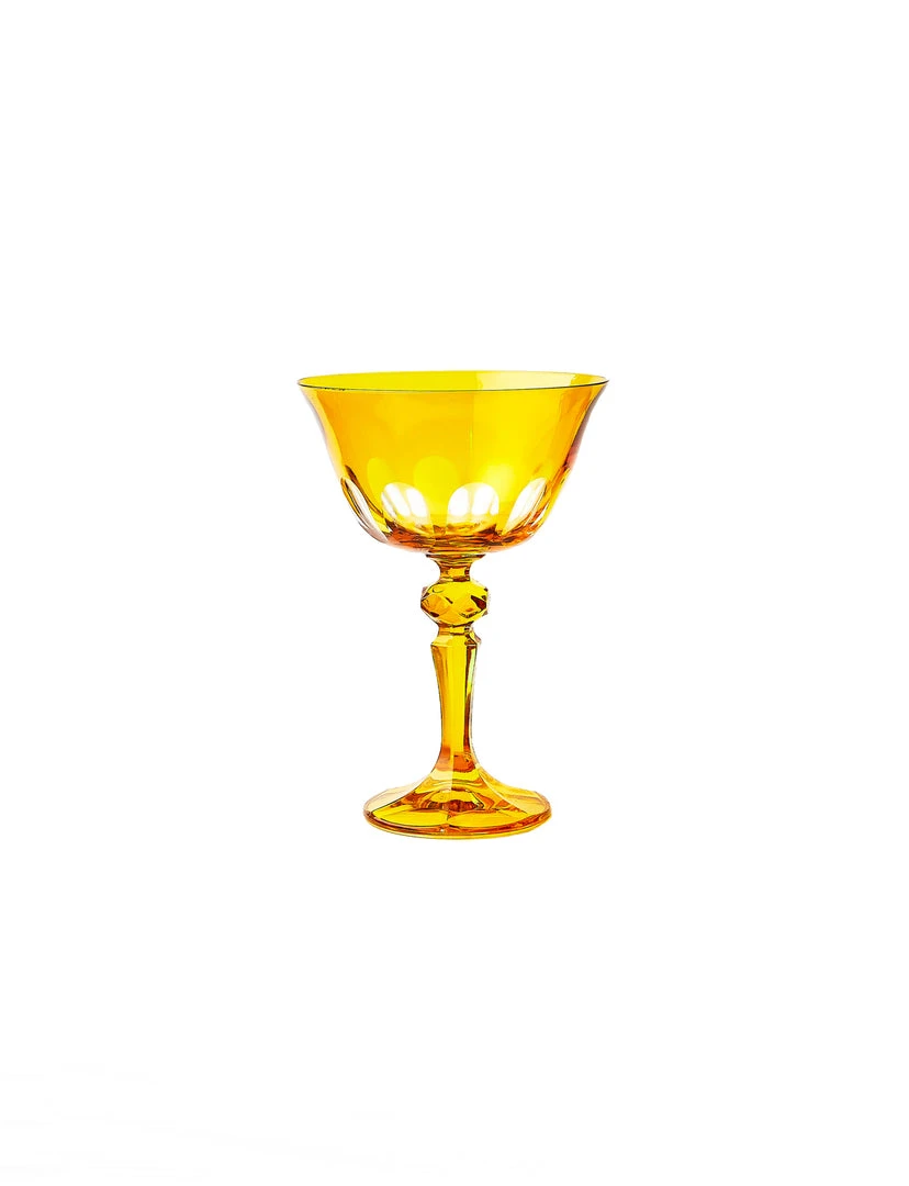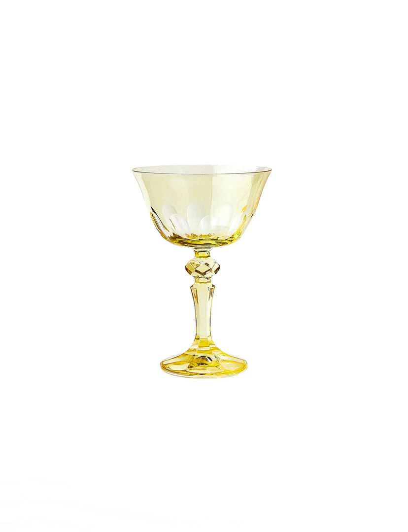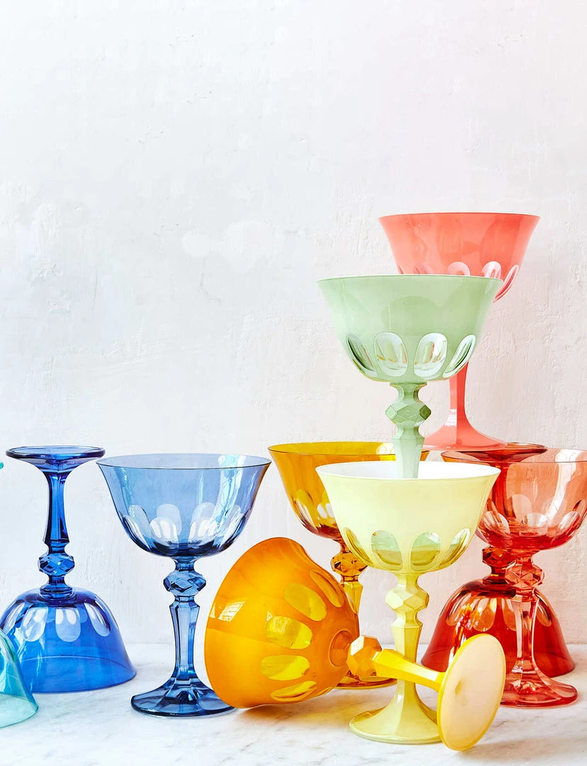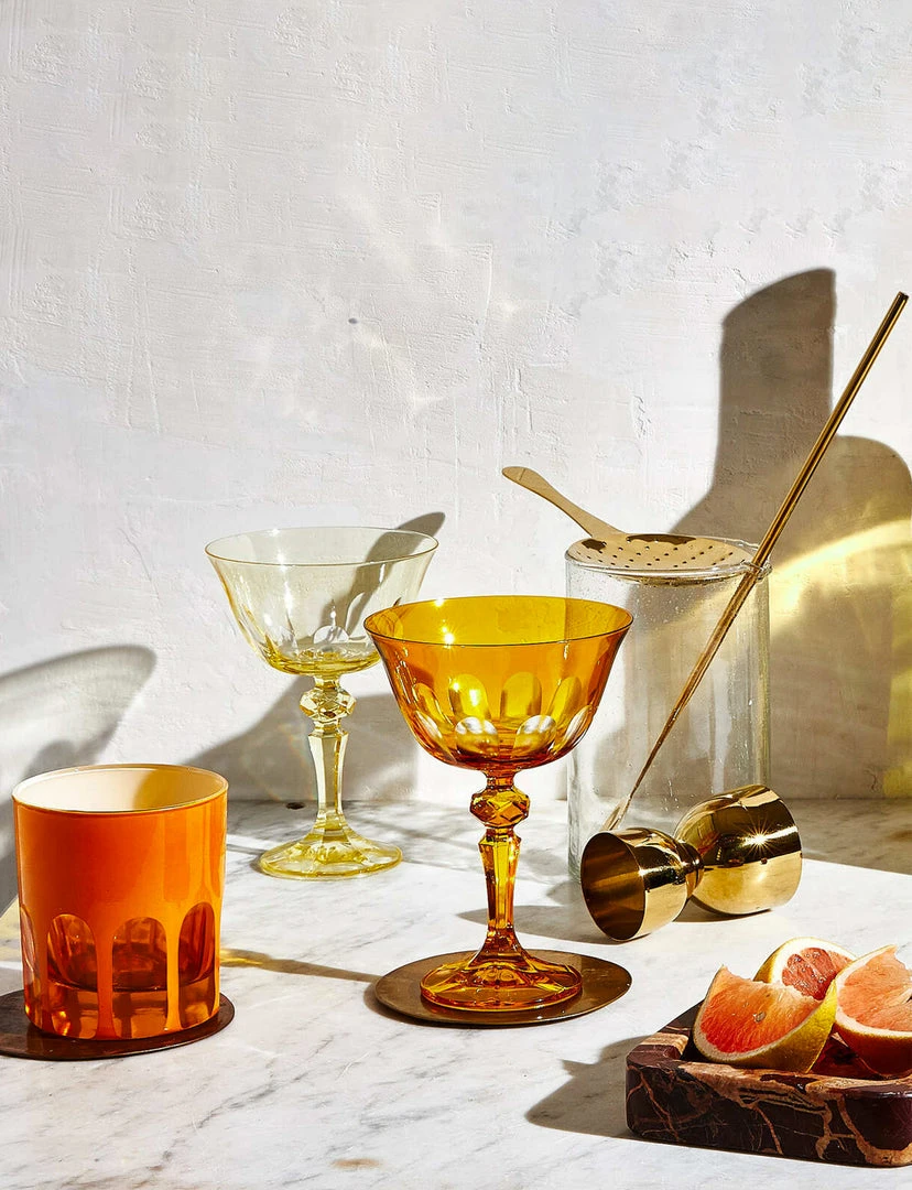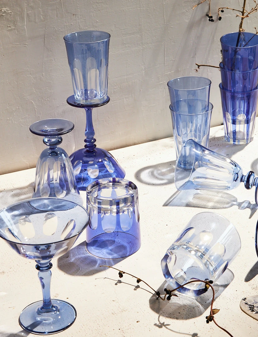 We were inspired to create this bespoke collection of colorfully festive drinking glasses on a trip to Italy’s beloved Floating City. Designed in homage to the defining arches that adorn Venice’s most iconic bridge, our Rialto Glassware comes in four distinct shapes and fourteen signature colors; the Old Fashioned is ideal for a dram, while the Coupe serves up everything from champagne to sorbet, and both the Tumbler and the Tulip will do the trick for both water and wine. This unique glassware, finished by hand in Turkey, requires a multi-step process that is executed by artisans. No two are exactly alike, and subtle nuances in depth of color and cutwork are to be expected and embraced. Choose between these opaque colors: Salmon, Oxblood, Crème, Pale Sage, Warm Gray, and Saffron, or these translucent colors: Moon Glow, Thistle, Lolita, Millicent, Menthe, and Ginger.