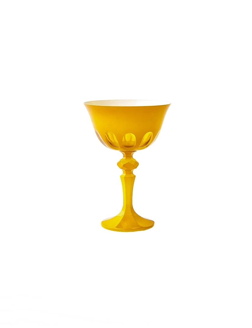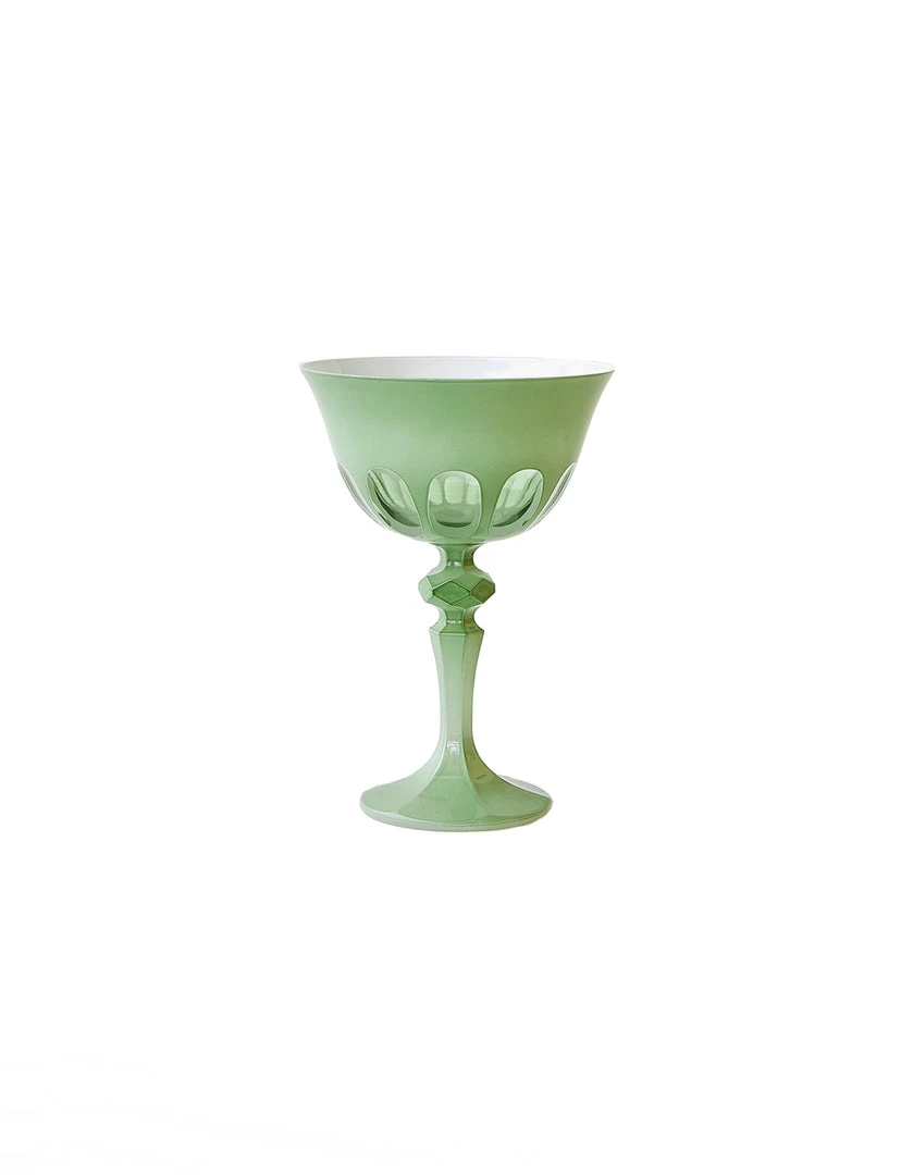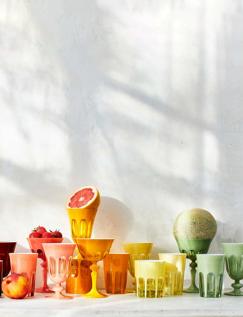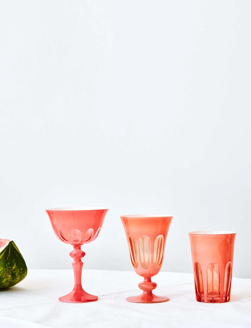 We were inspired to create this bespoke collection of colorfully festive drinking glasses on a trip to Italy’s beloved Floating City. Designed in homage to the defining arches that adorn Venice’s most iconic bridge, our Rialto Glassware comes in four distinct shapes and fourteen signature colors; the Old Fashioned is ideal for a dram, while the Coupe serves up everything from champagne to sorbet, and both the Tumbler and the Tulip will do the trick for both water and wine. This unique glassware, finished by hand in Turkey, requires a multi-step process that is executed by artisans. No two are exactly alike, and subtle nuances in depth of color and cutwork are to be expected and embraced. Choose between these opaque colors: Salmon, Oxblood, Crème, Pale Sage, Warm Gray, and Saffron, or these translucent colors: Moon Glow, Thistle, Lolita, Kitten, Millicent, Menthe, Ginger, and Limoncello.