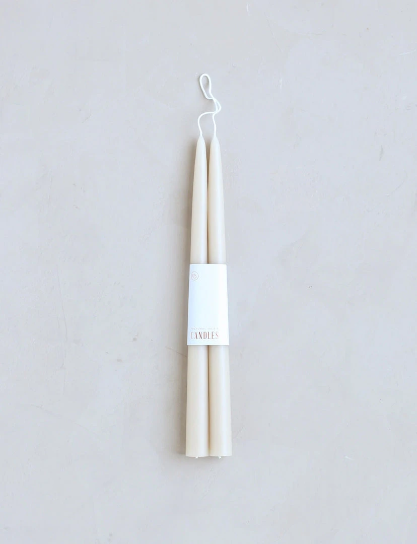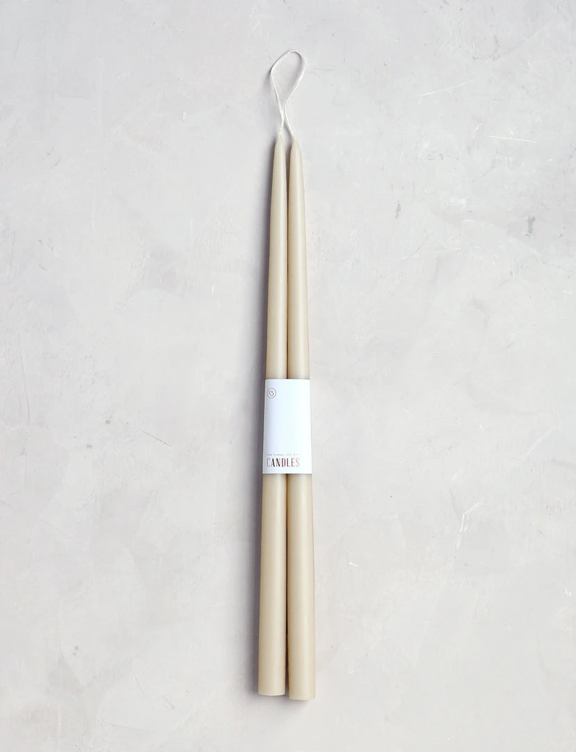Our tapers are crafted to burn drip-free at a rate of approximately 1 hour per inch. Each candle is dipped 35 times for a superior depth of color, and pairs are joined by a braided cotton wick for the cleanest burn.