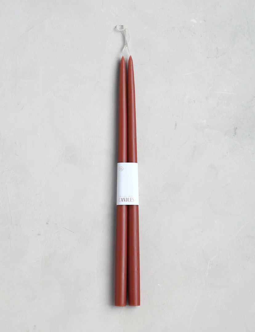 Our tapers are crafted to burn drip-free at a rate of approximately 1 hour per inch. Each candle is dipped 35 times for a superior depth of color, and pairs are joined by a braided cotton wick for the cleanest burn.