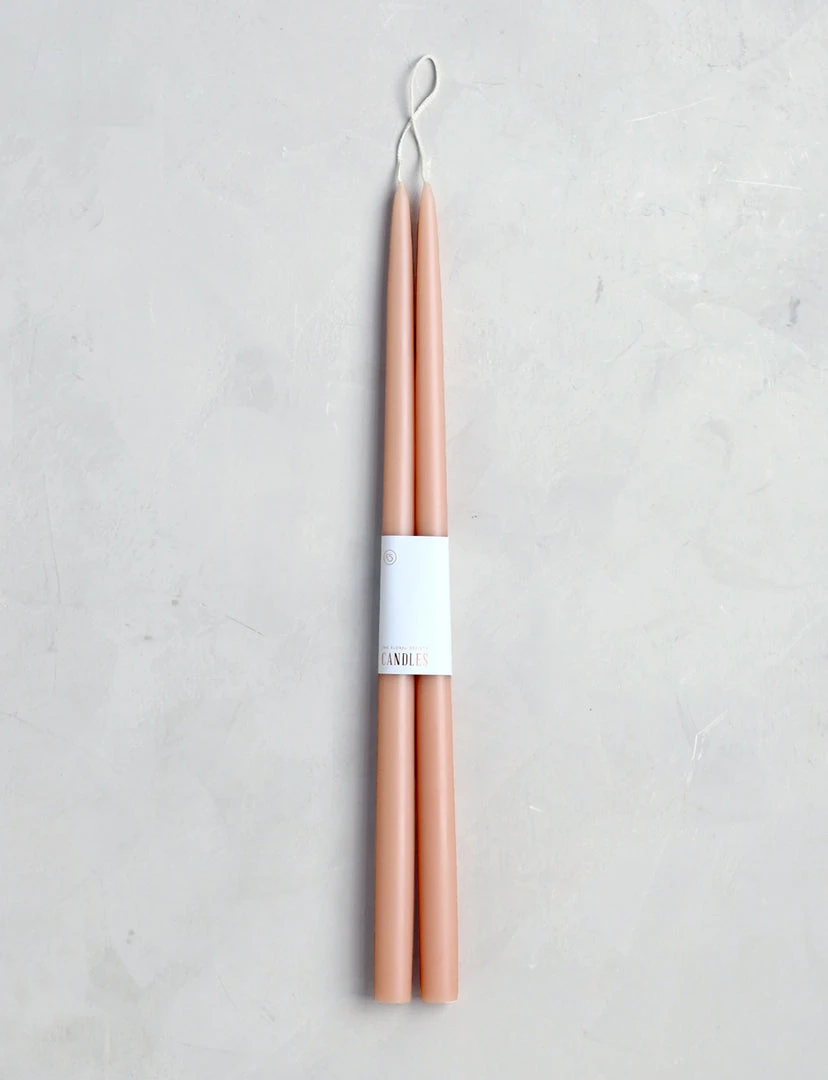 Our tapers are crafted to burn drip-free at a rate of approximately 1 hour per inch. Each candle is dipped 35 times for a superior depth of color, and pairs are joined by a braided cotton wick for the cleanest burn.
