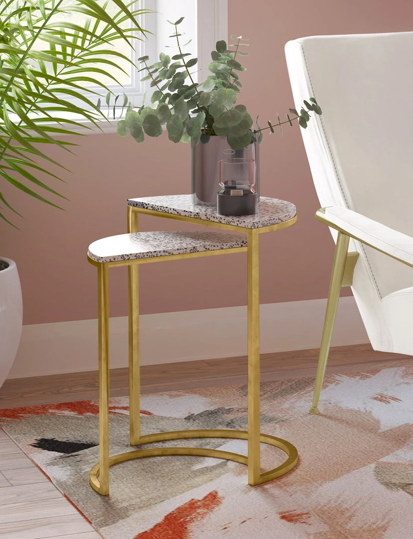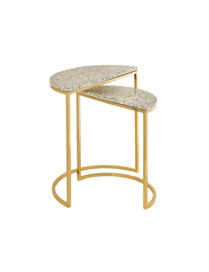 Description: Simply elegant, the Crete tables boast a gold-finished half-moon frame topped with stunning, speckled terrazzo. Use them together or separately to easily enhance your space.