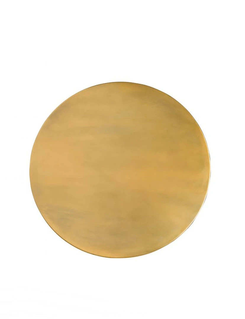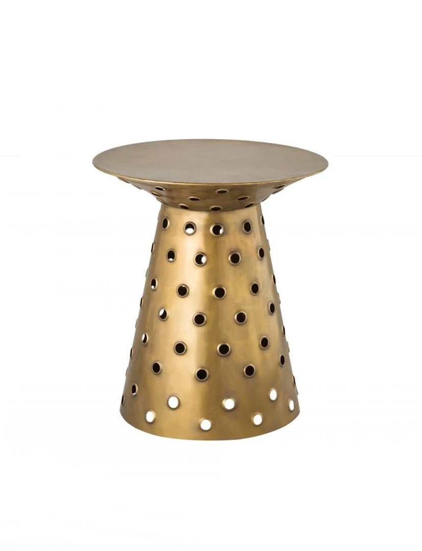 Handcrafted from iron and finished in antique brass. Its hourglass shape and decorative design make this occasional table the focal point of your space.