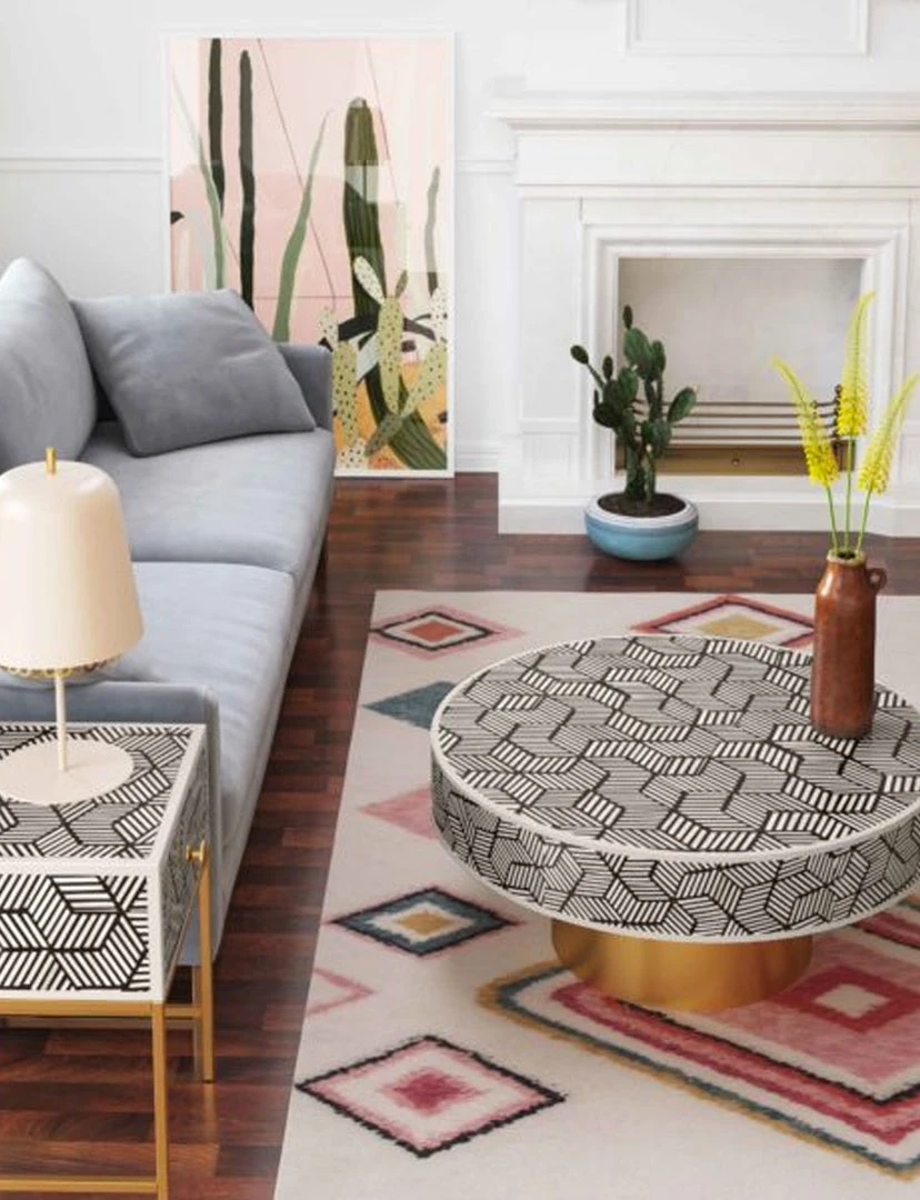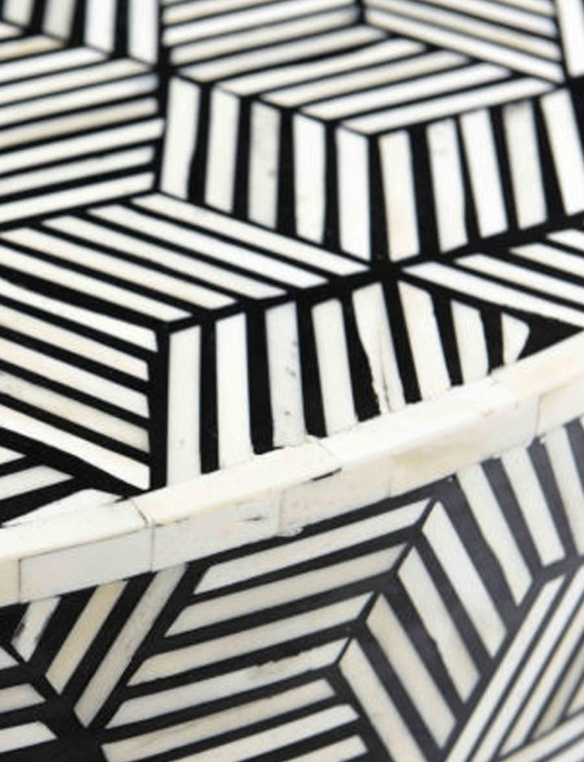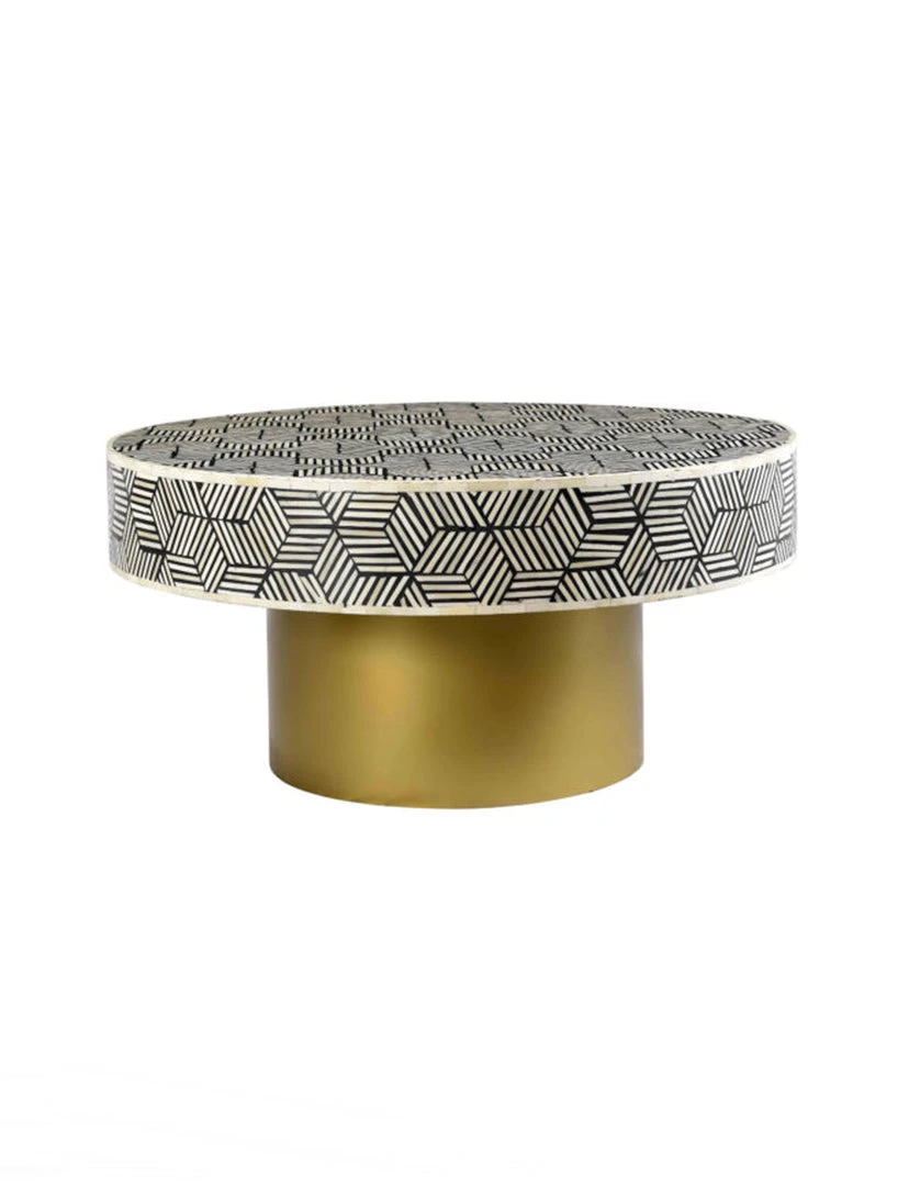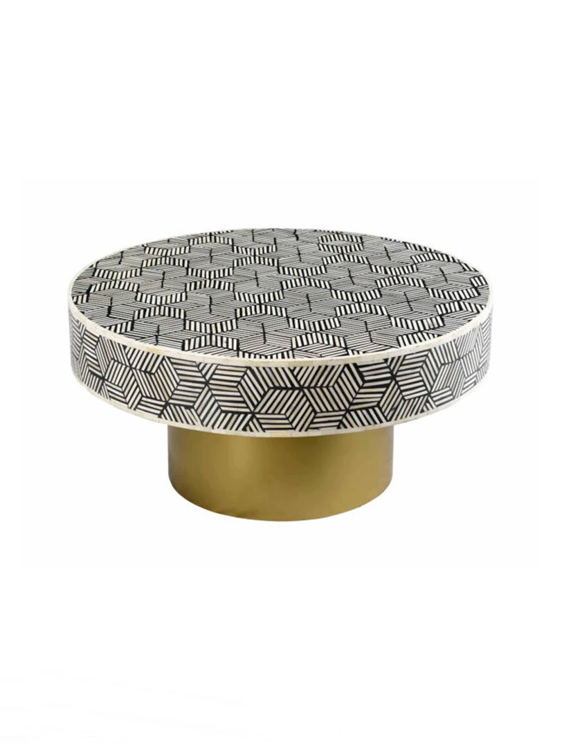 A gorgeous, geometric design is formed from meticulously inlaid hand-carved bone and complemented with a matte brass pedestal base. Available in cocktail and side table sizes, it’ll stand out by itself or as a set.