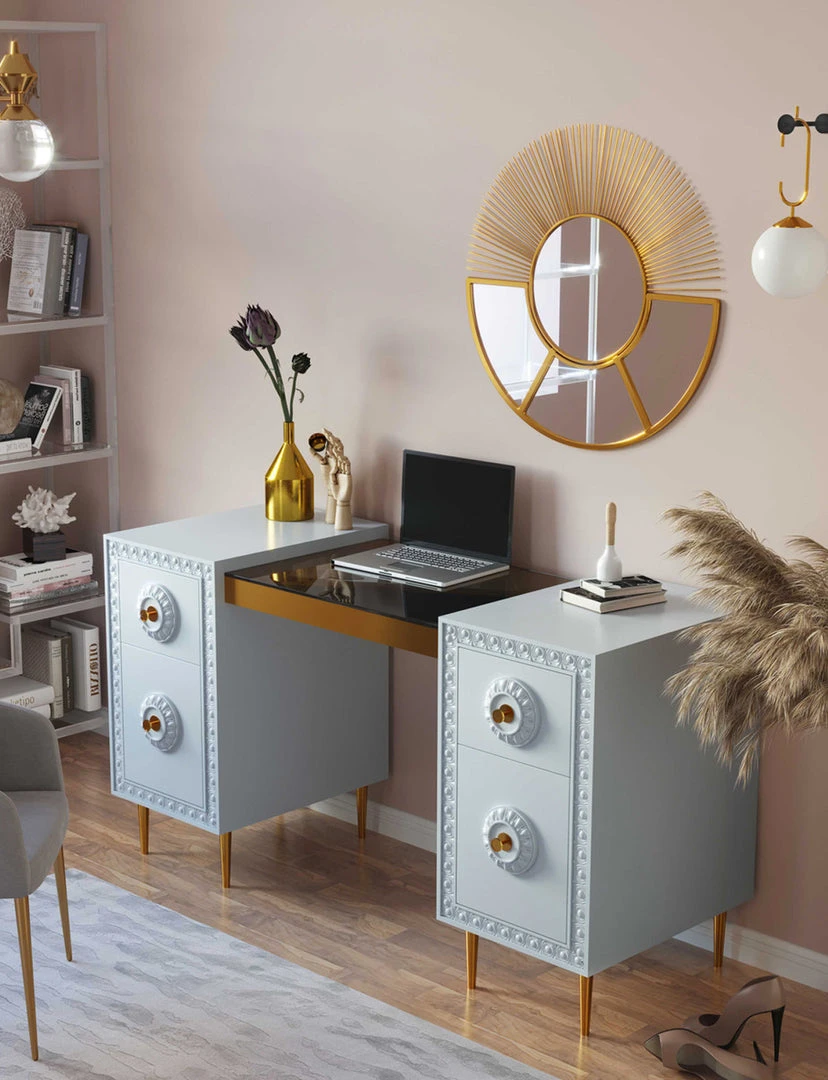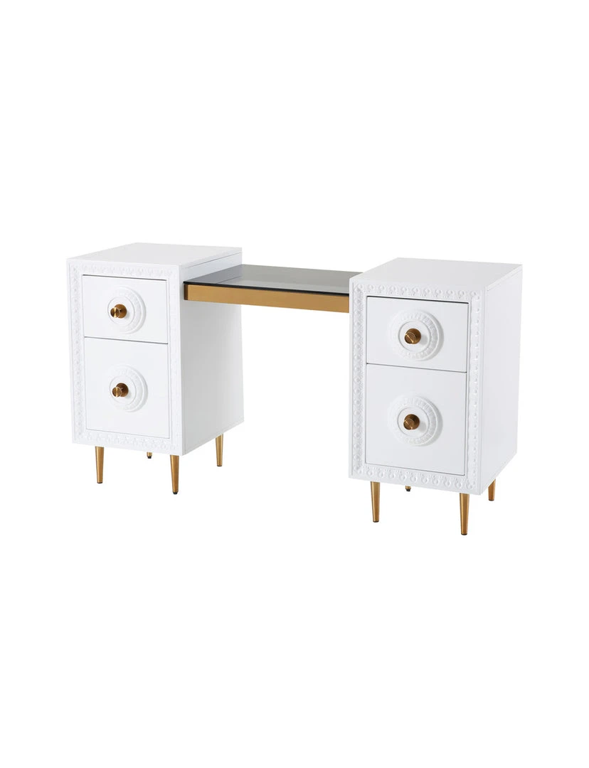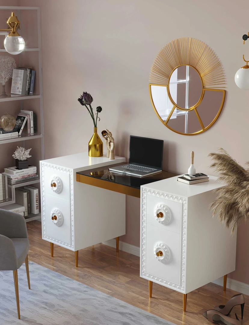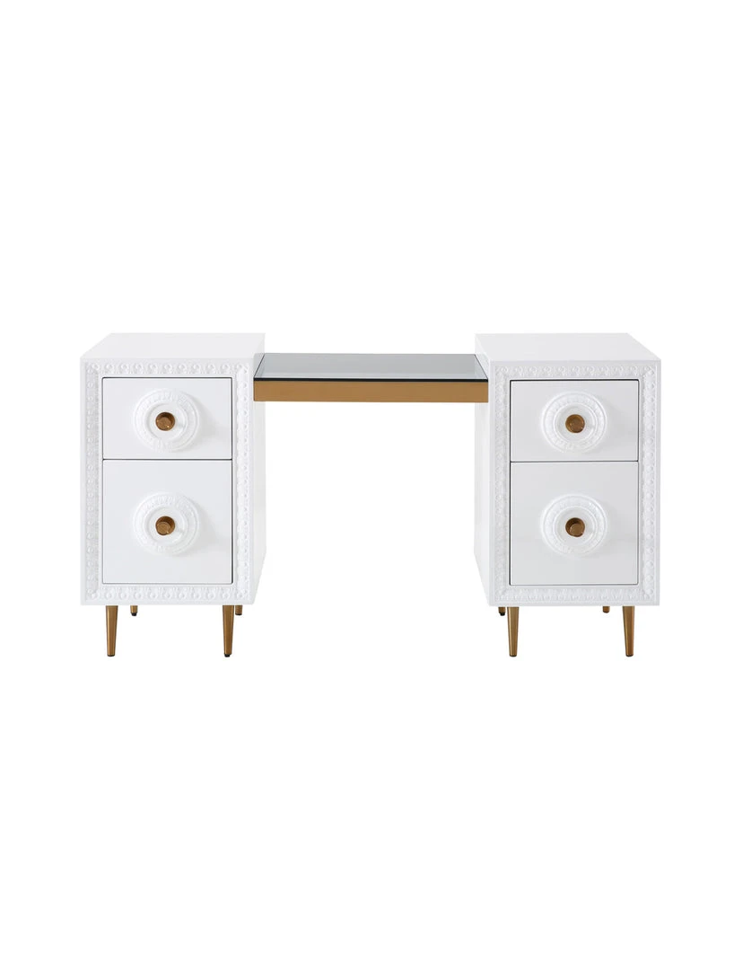 Work in fabulously glam fashion with the Bovi desk. Featuring a lacquer finish with intricate molding, glass top, gold hardware and tons of storage space, productivity is about to become a whole lot more stylish.
