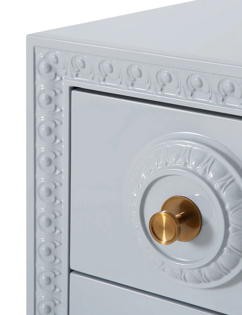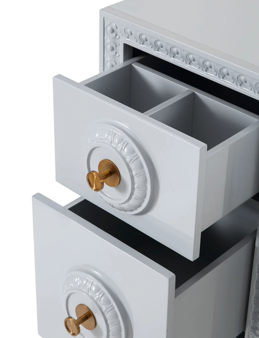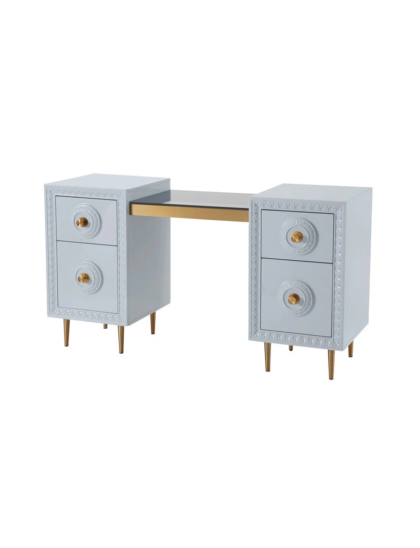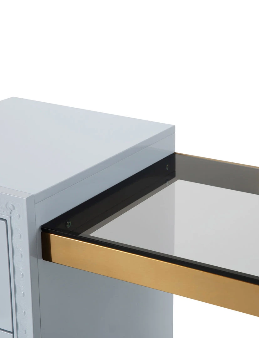 Work in fabulously glam fashion with the Bovi desk. Featuring a lacquer finish with intricate molding, glass top, gold hardware and tons of storage space, productivity is about to become a whole lot more stylish.