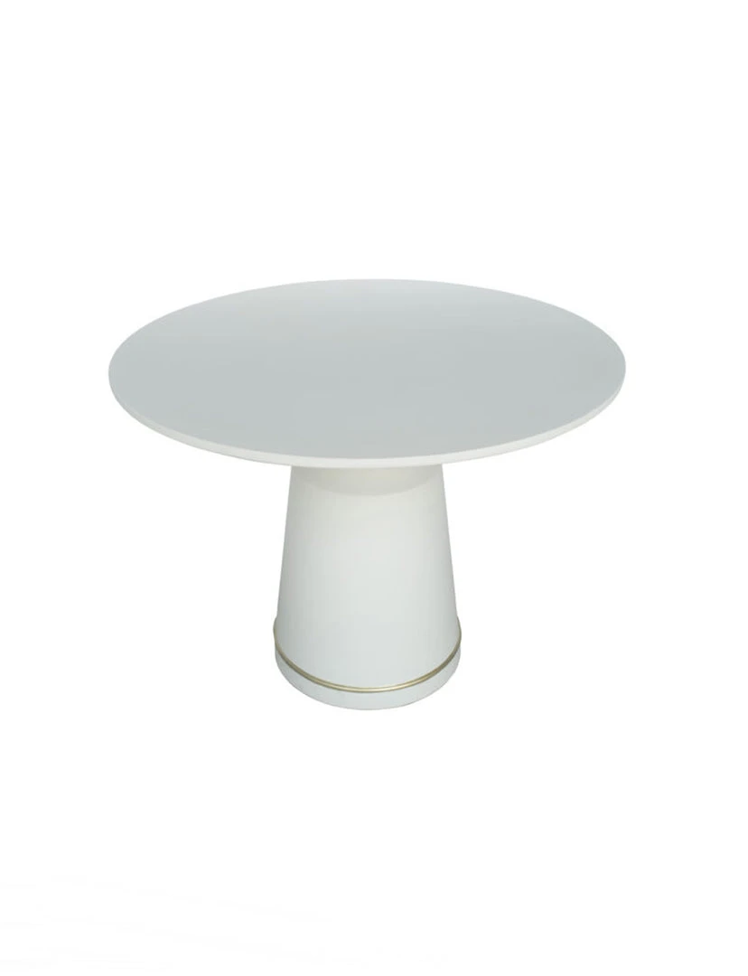 A true work of art and craftsmanship, the Drew collection combines durability with chic style. Its concrete tabletop is anchored to a matching pedestal base, enhanced by two gold rings. Available in grey or off-white and dining or coffee sizes.
