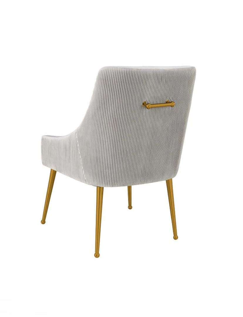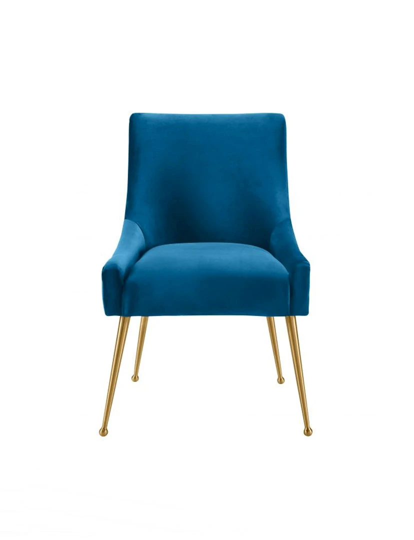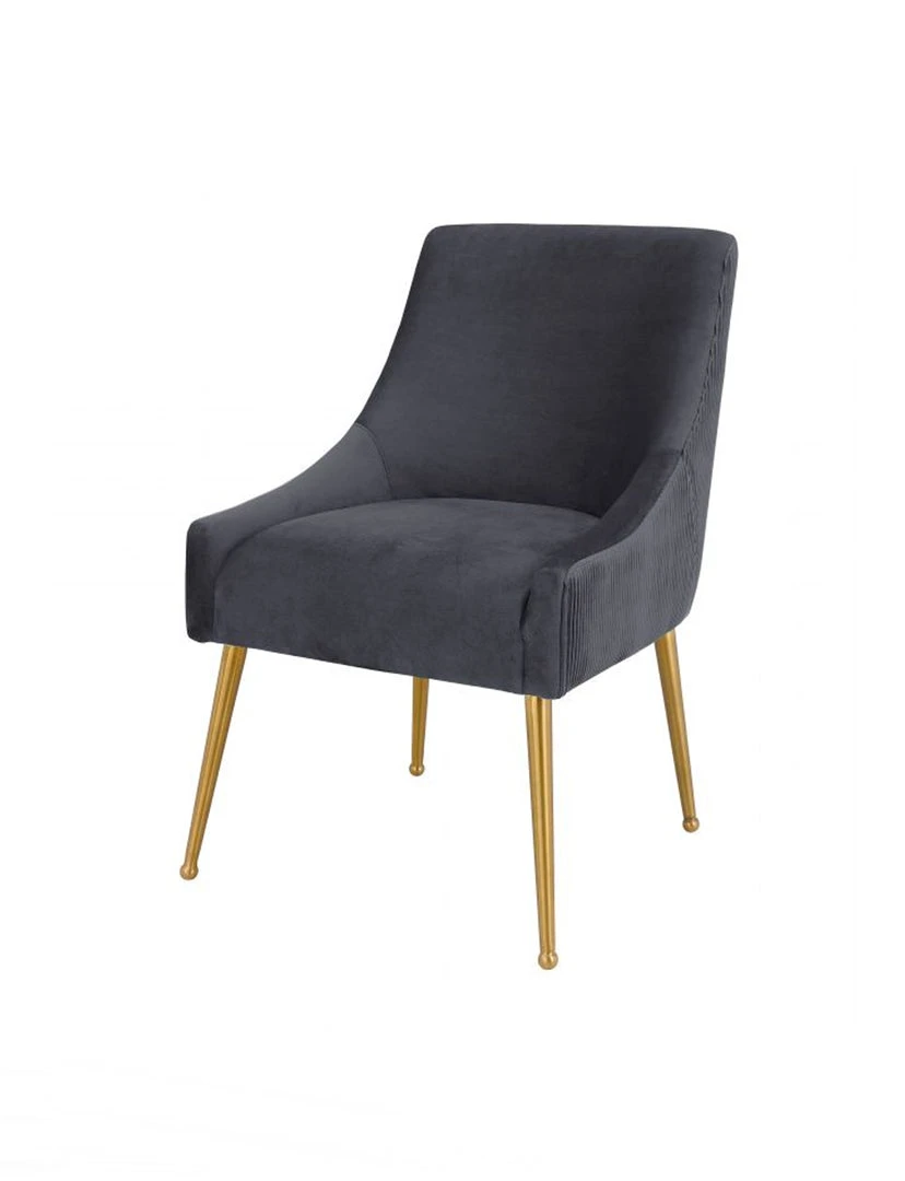 Sit pretty in this sumptuous yet durable velvet chair. The Heize dazzles as a dining chair or as an accent piece. Available in several colors with fab gold stainless steel legs and a matching handle on the back. Prop it into any room for a luxe, glamour effect.