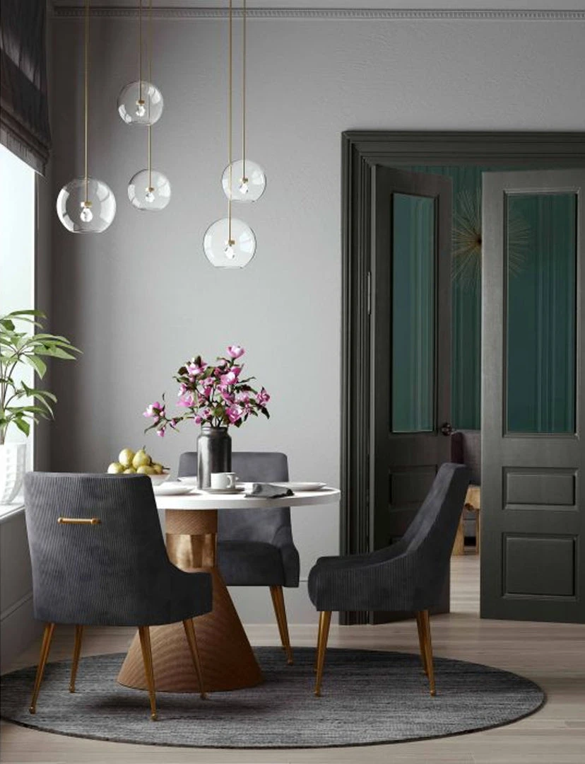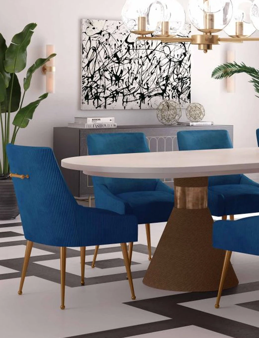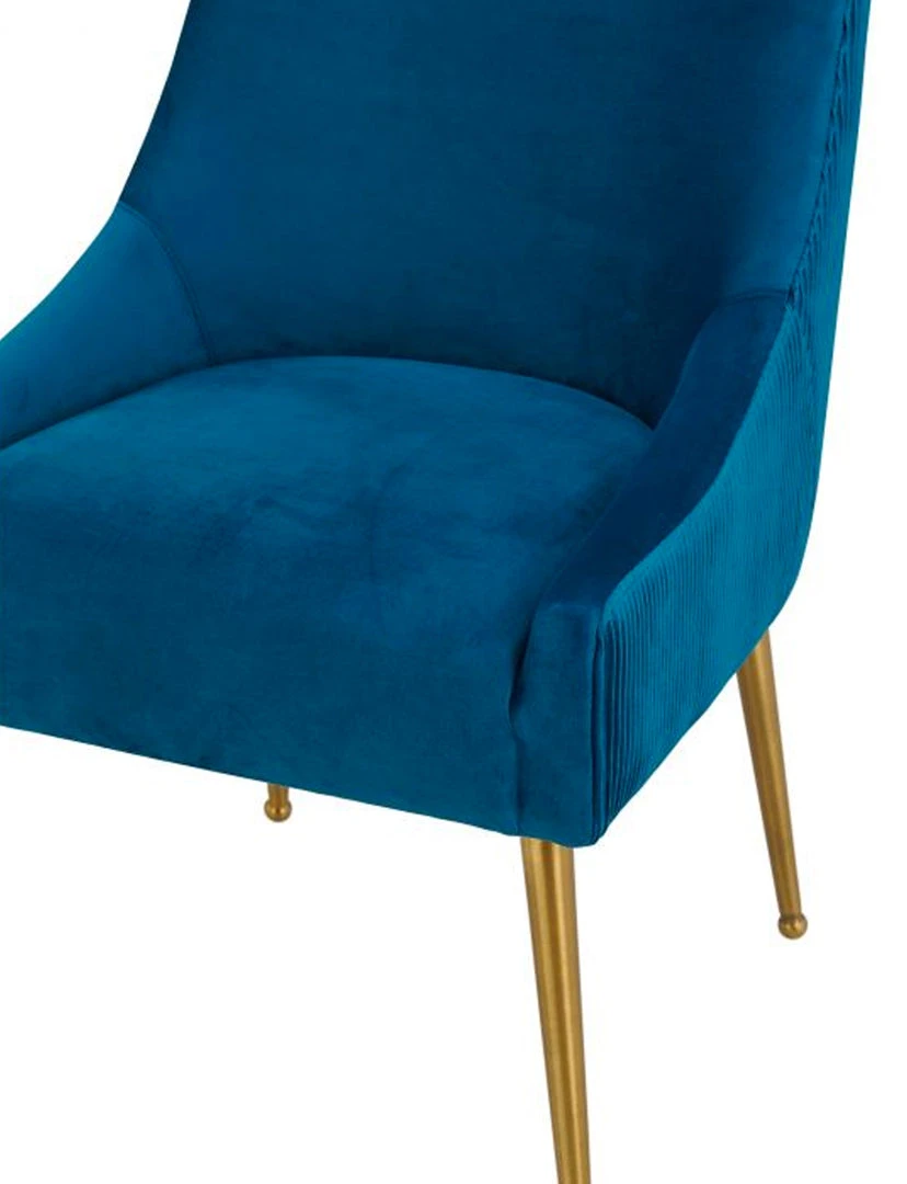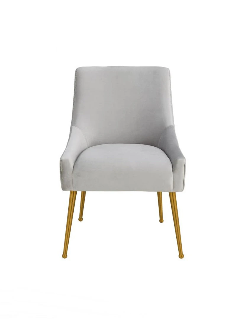 Sit pretty in this sumptuous yet durable velvet chair. The Heize dazzles as a dining chair or as an accent piece. Available in several colors with fab gold stainless steel legs and a matching handle on the back. Prop it into any room for a luxe, glamour effect.