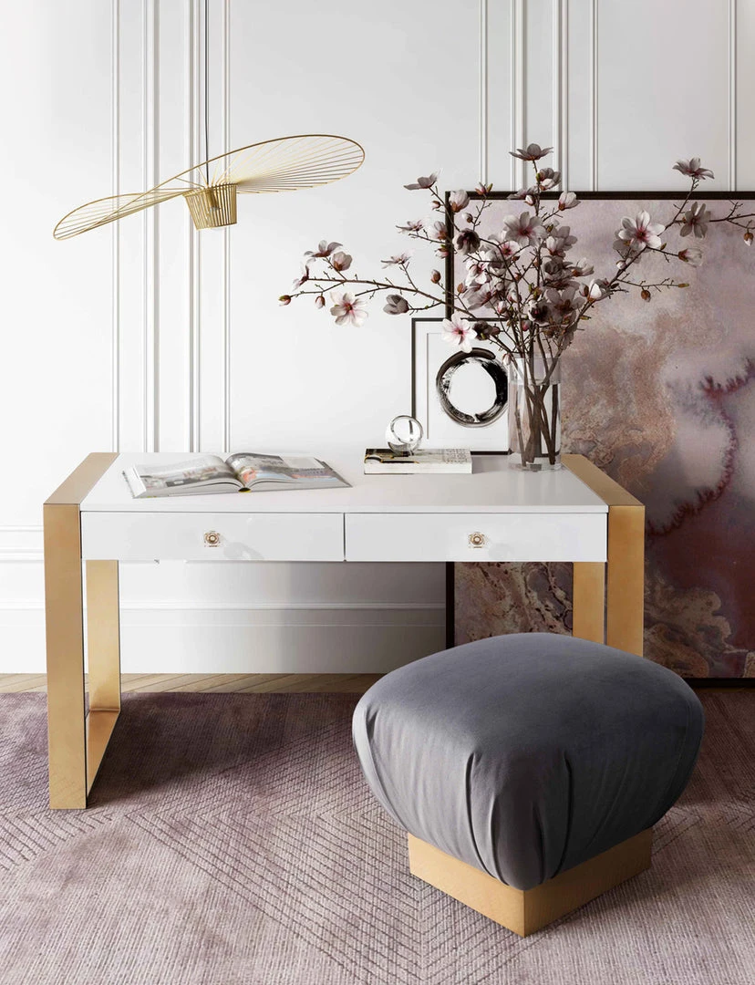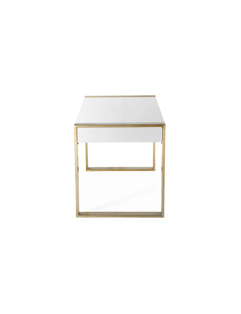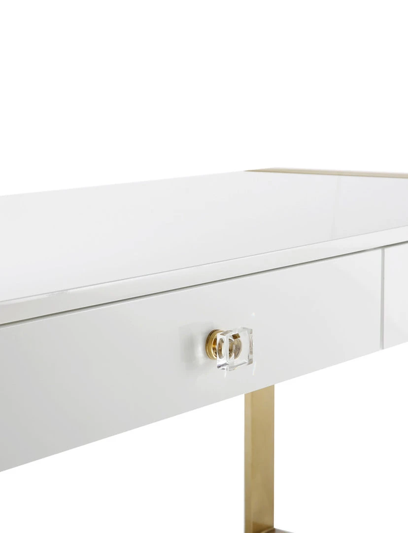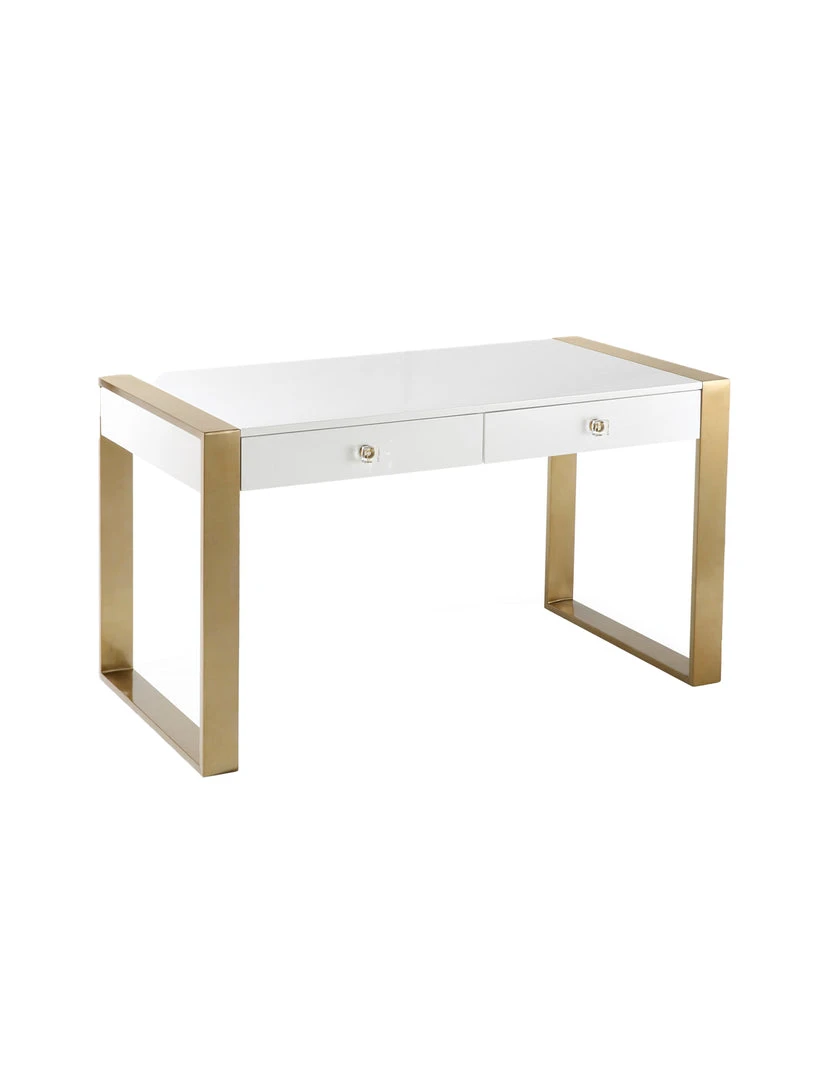 Work in fabulously glam style with the Kelly desk. Featuring two soft closing drawers, acrylic handles and a lacquered wood top supported by twin gold sleigh legs, your office will be as trendy as you are.