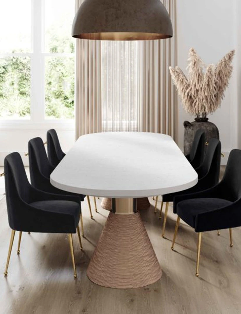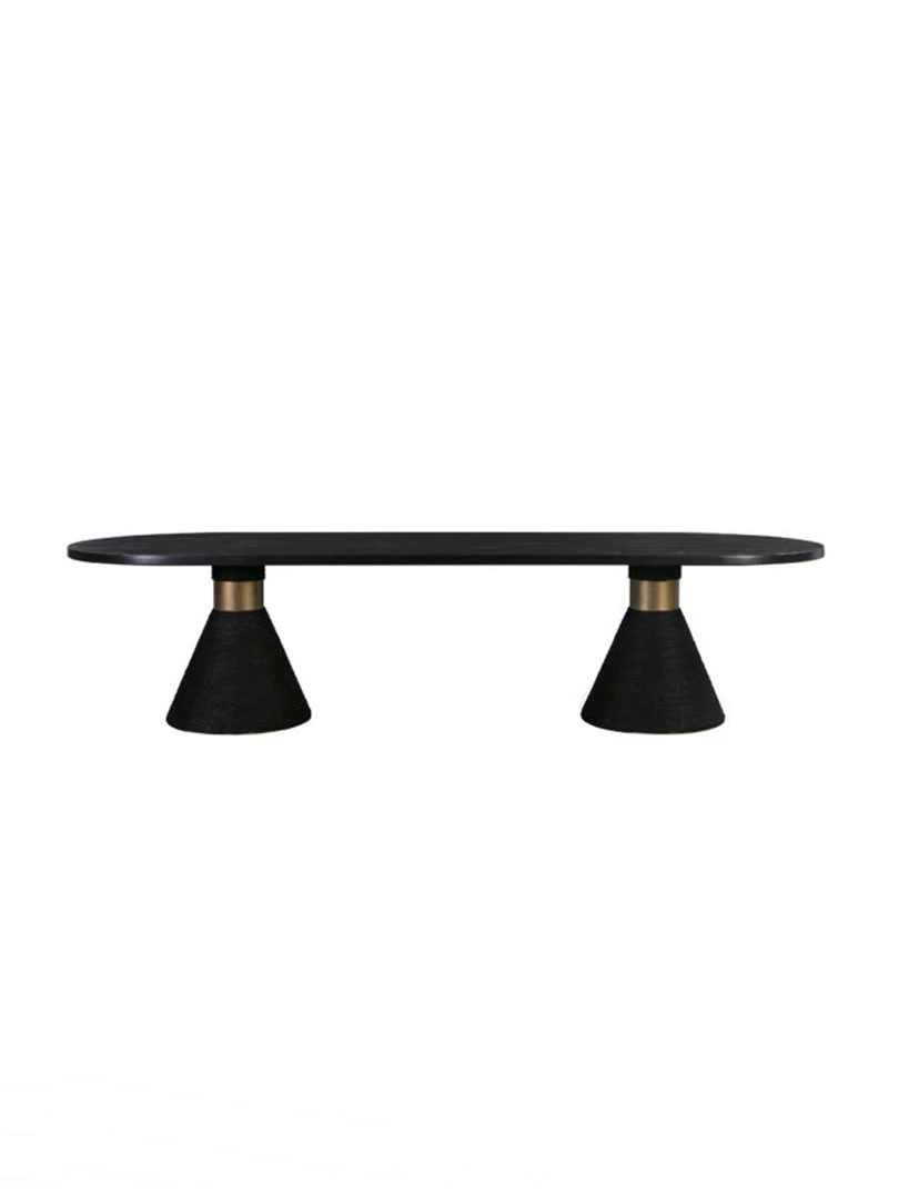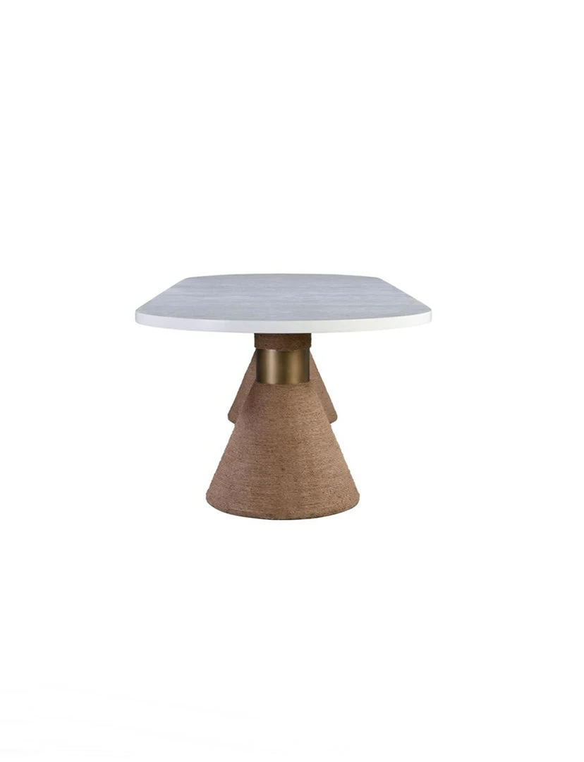 Coastal elements blend swimmingly with the modern silhouette of the Rose Dining Table. Available in two size and color options, its acacia top and textured rope base bring summer vibes to your home all year long.