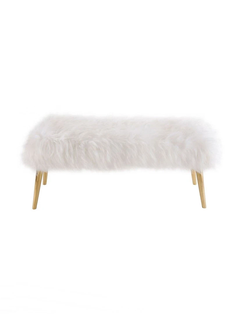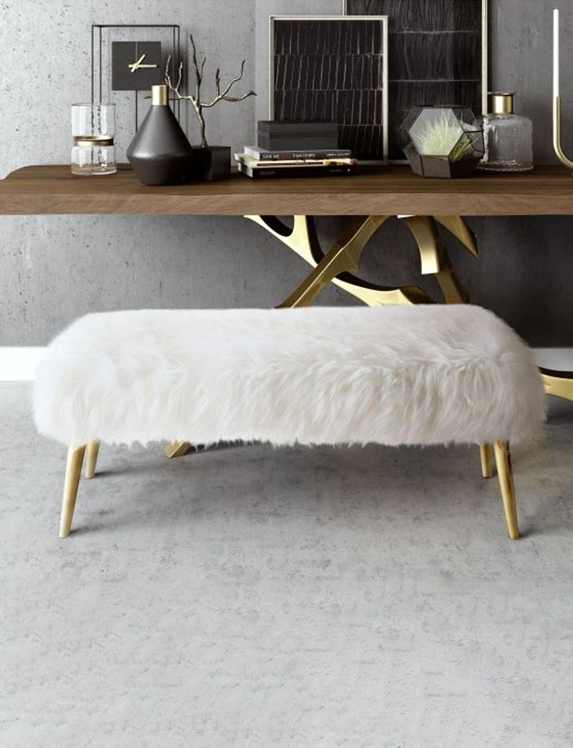 Made with genuine sheepskin, the Tera bench is the perfect chic accessory that is versatile for a verity of uses and spaces. The fabulously fluffy top is perched upon gold stainless steel conical shaped legs.