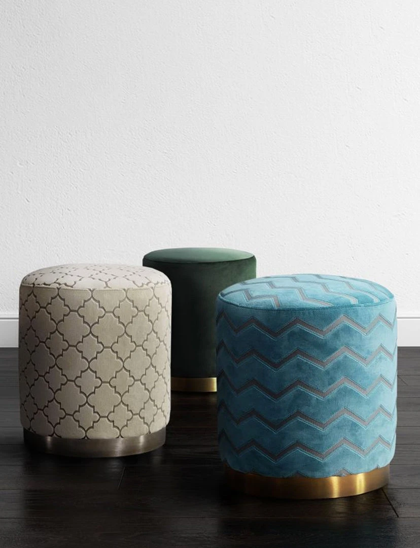 Moroccan influences, contemporary patterns, and brushed metal make for one perfectly stylish piece. Our Opaly ottomans are a new fave. Use one or bunch them together to create a luxe vibe in any room. Velvet upholstery available in multiple color and fabric options.