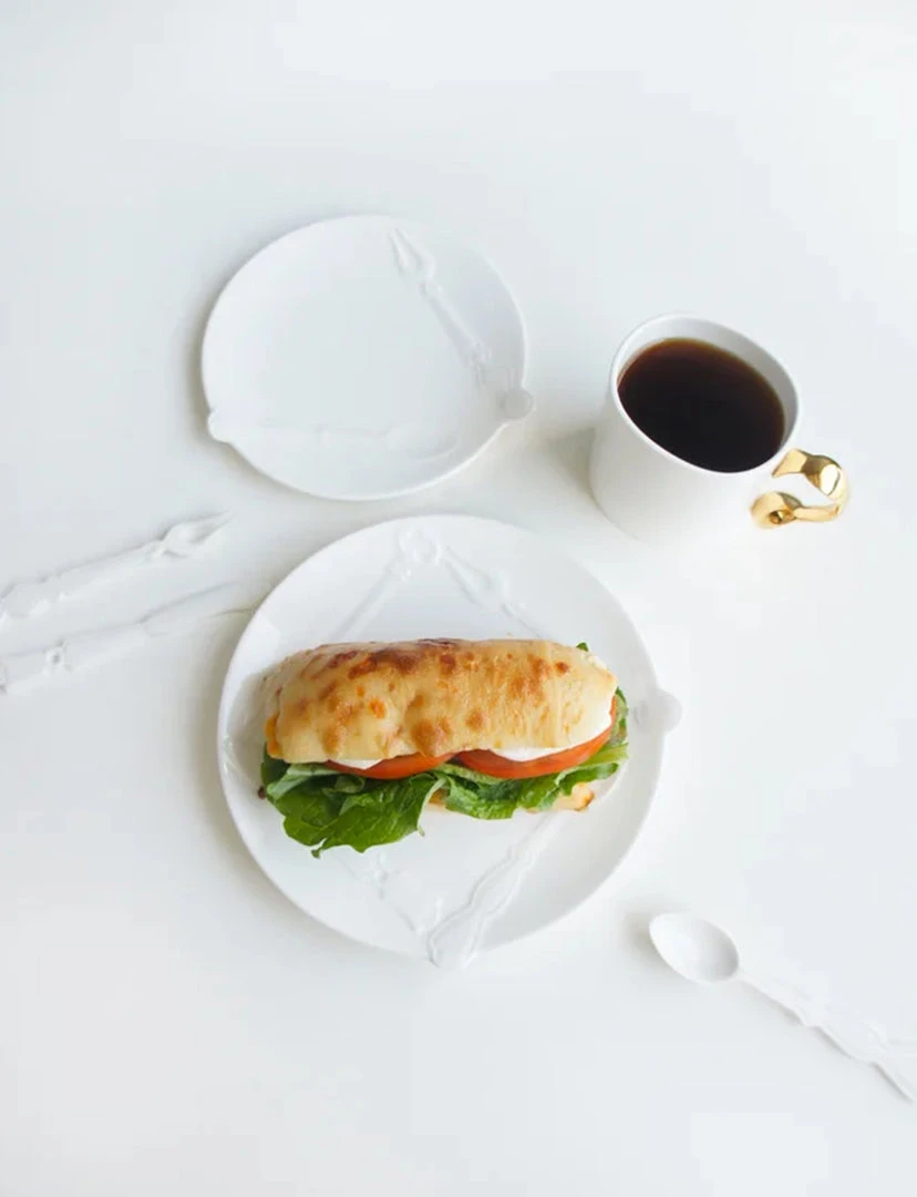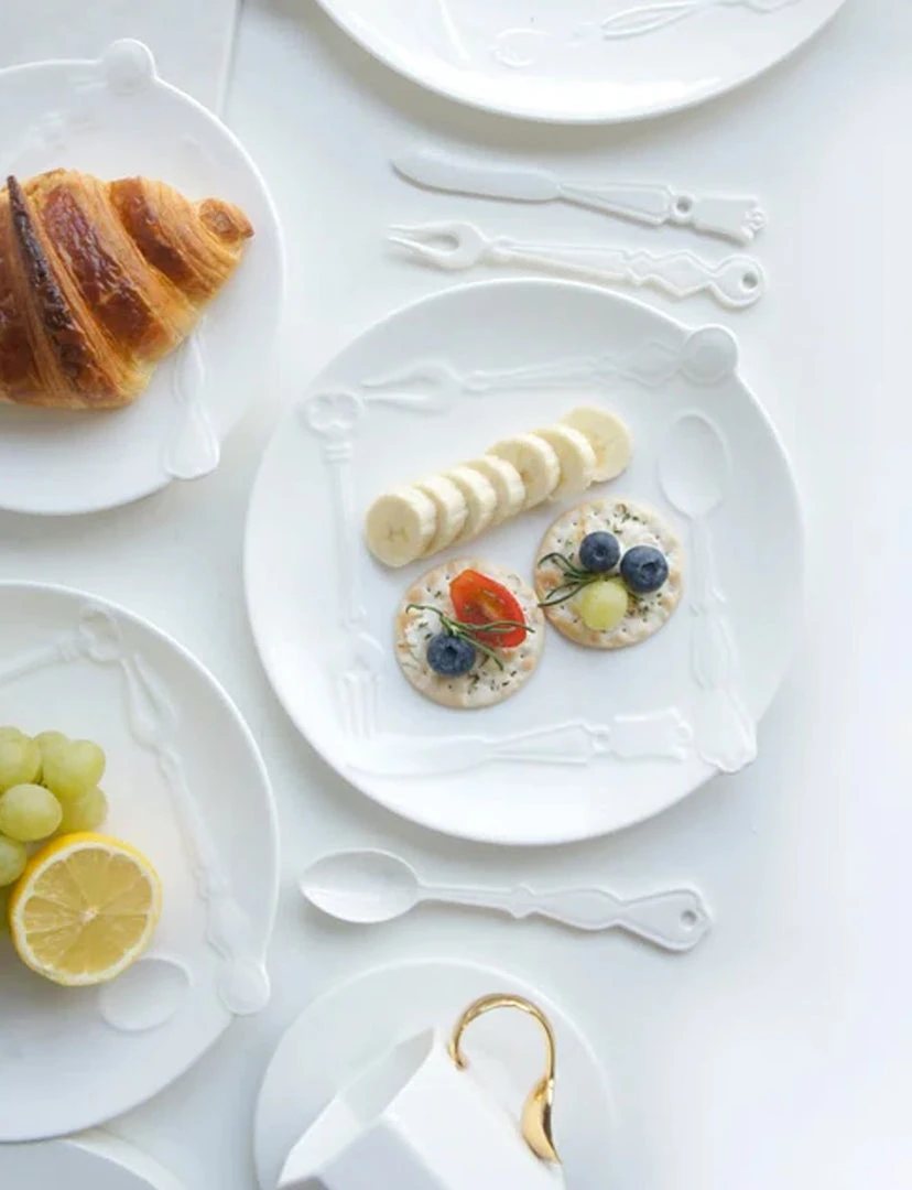 The Cutlery Salad Plate. Antique Flatware meets modern Fine Bone China in this fascinating interpretation of Tableware. Antique cutlery shapes find themselves embossed on the pristine white surface to create a truly unique design. This plate is ideally sized for a salad, an appetizer or as a side plate in your classic table setting. Simplicity with a twist from the Cutlery Collection by Twig New York.