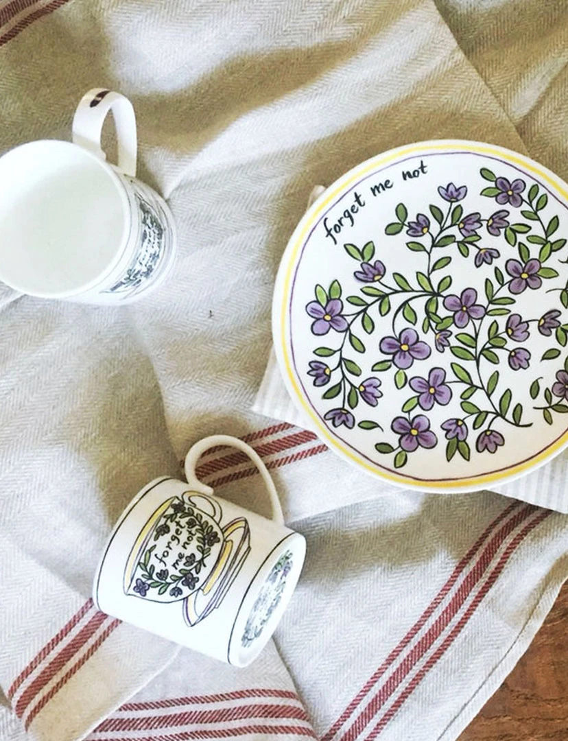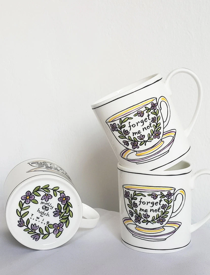 The Heritage Forget Me Not Mug. A modern and artistic twist on classic Fine Bone China. Inspired by floral patterns and the various hues of the forget me not flower. In this collection, even the underside of the mug is decorated as beautifully. The hand applied decals are designed to have an embossed texture as if engraved for an added richness to the unique design. This mug is ideally sized for coffee or tea. Modern yet classic from the Heritage Collection by Twig New York.