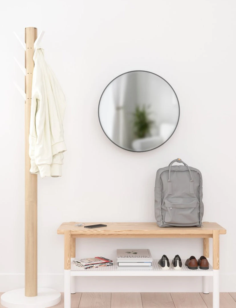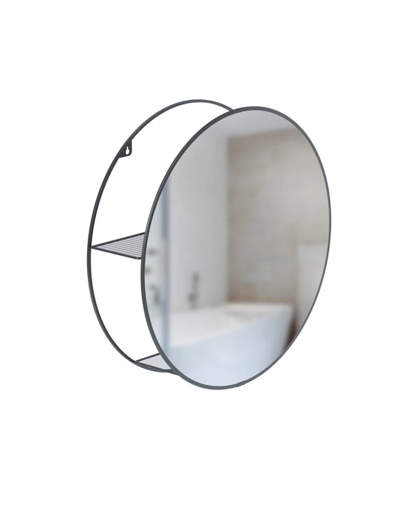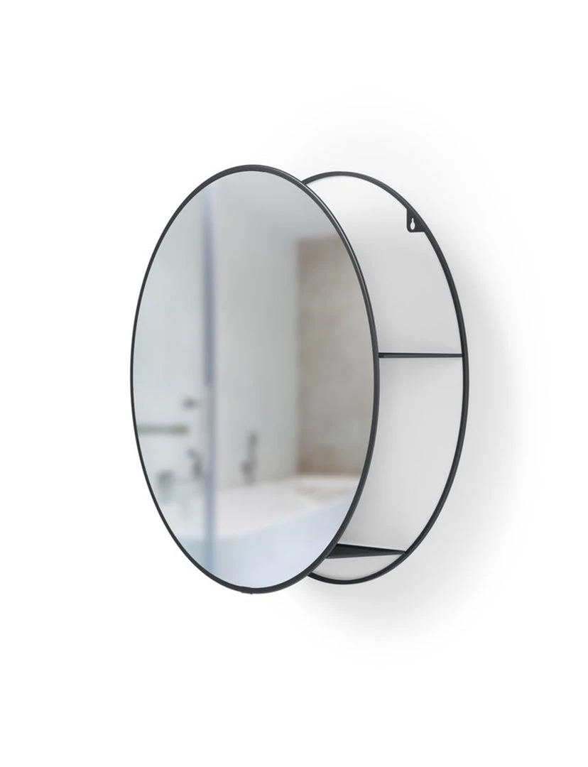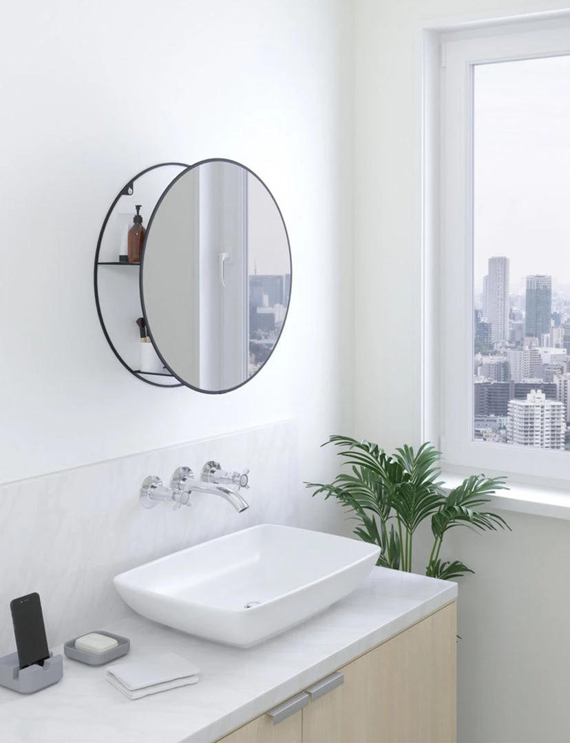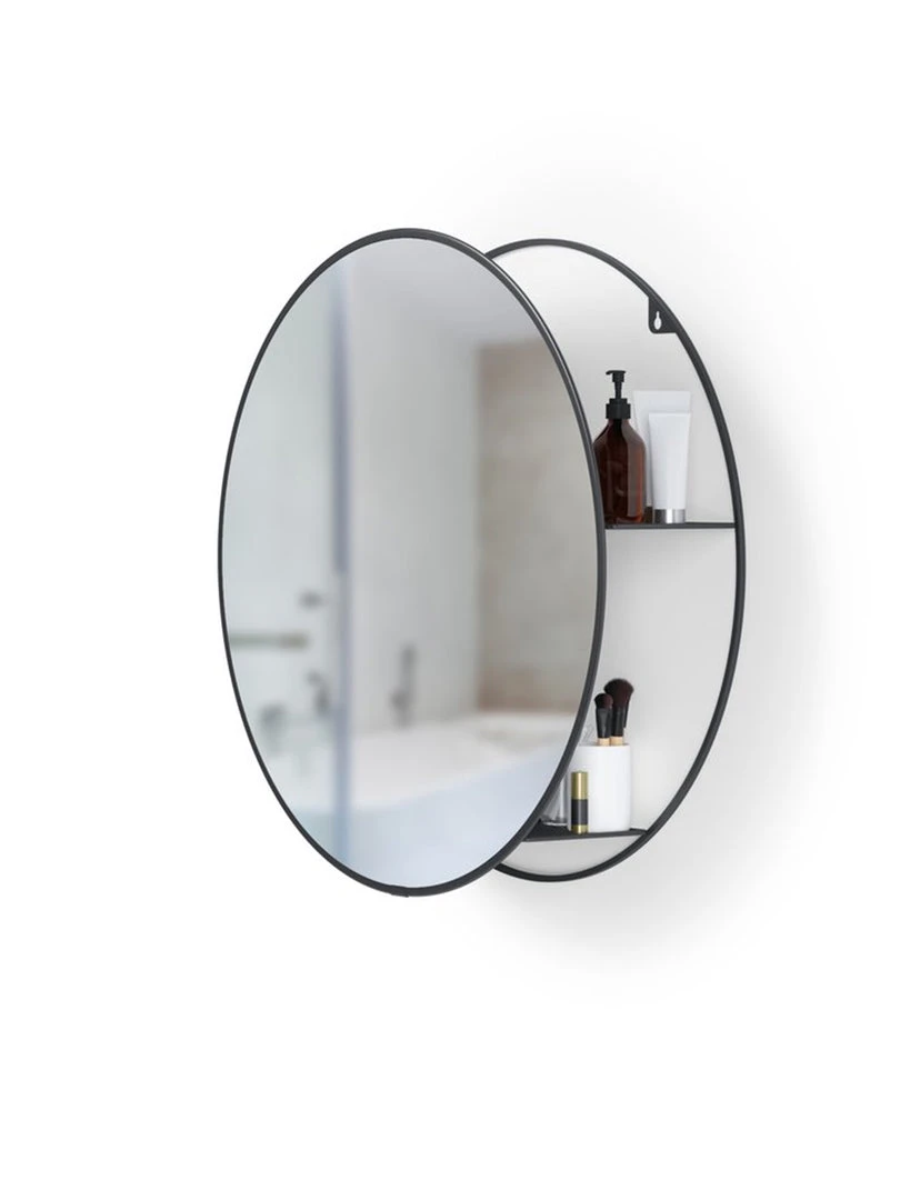 Many countertops and tables are often messy and disorganized with everyday items and products. In a busy household, practical storage solutions are a must, but often times they look bulky or take up crucial floor space. In other cases, there is limited to no space to store and organize belongings, resulting in an overflowing cabinet or drawer. Cinco is both a practical and decorative mirror and storage unit that fits well in many spaces. Its hidden storage shelves conceal clutter and organize your belongings all while being stored behind a modern and unique large round mirror. This wall mirror is ideal for small space living as it provides extra storage while bringing light to your space. It can be used in entryways for keys, as a vanity mirror in your bathroom or anywhere else you want extra storage or a beautiful mirror in your home. With a large circular design, Cinco effortlessly draws in light and opens up space, all while keeping necessities in arms reach and out of sight.