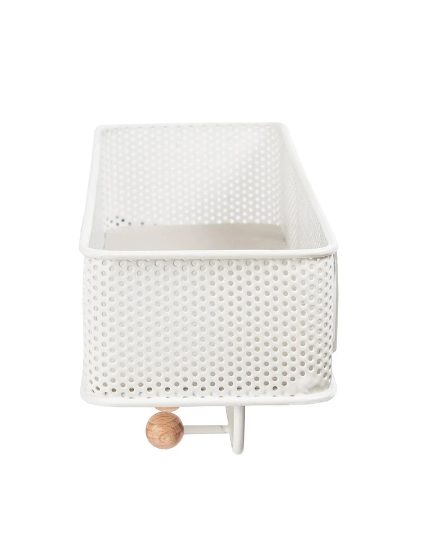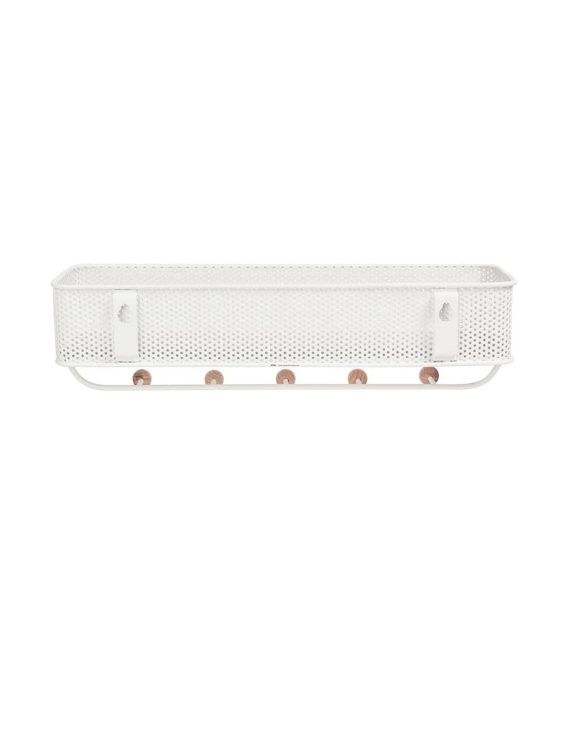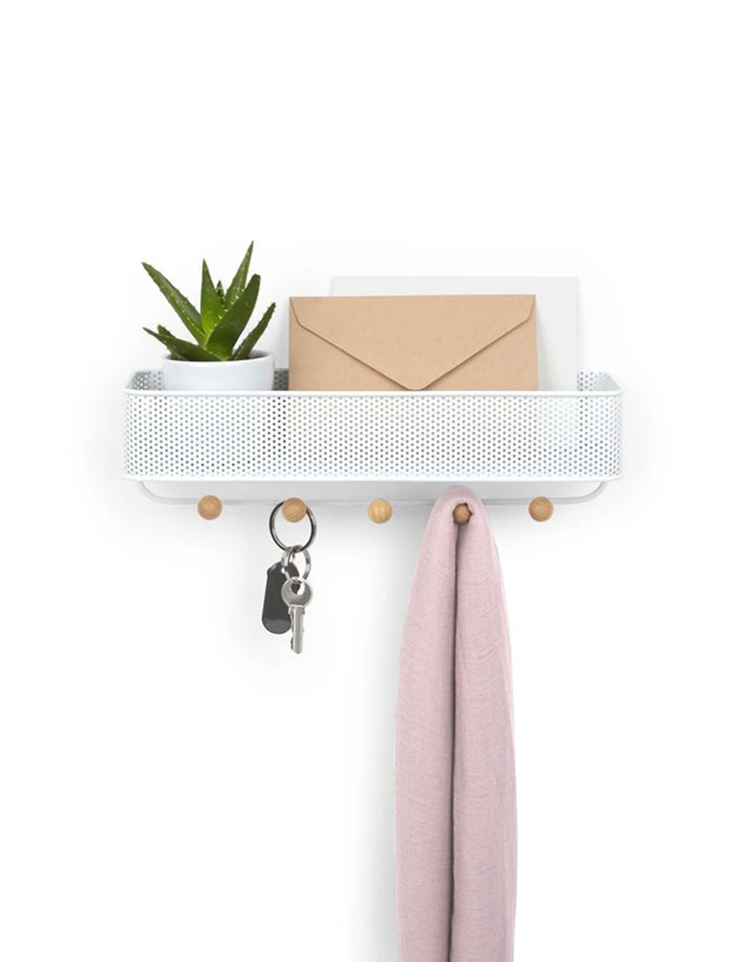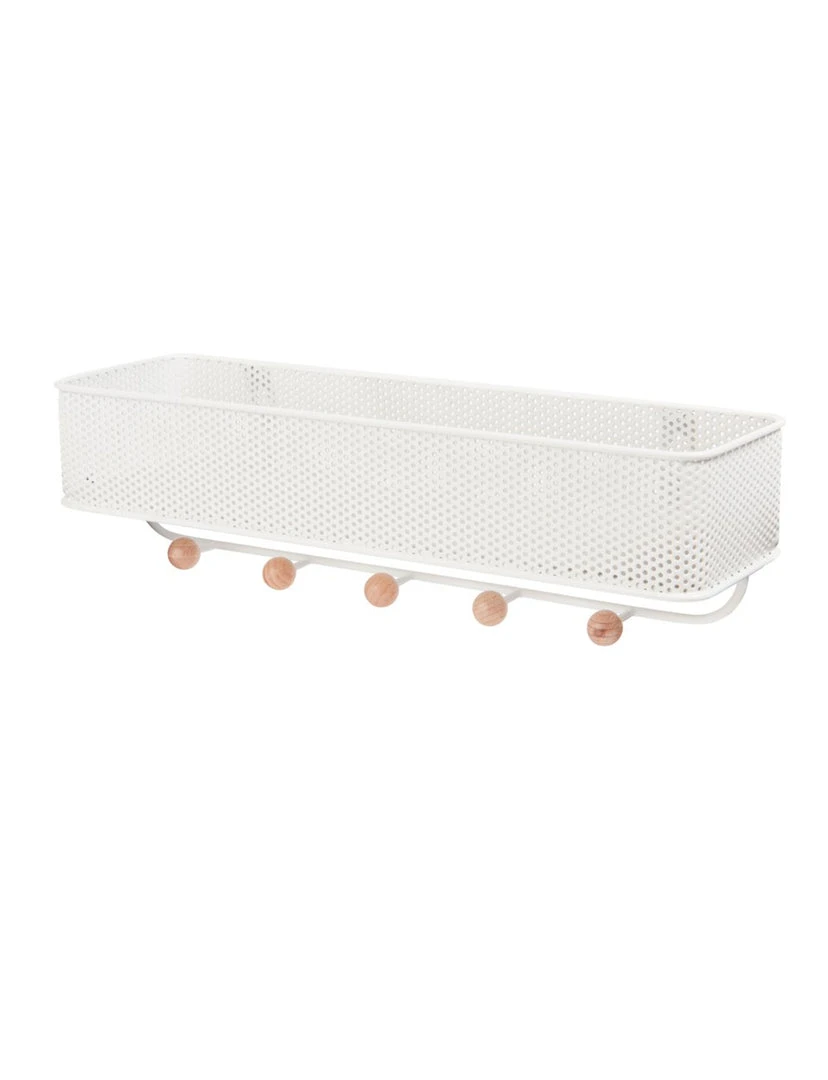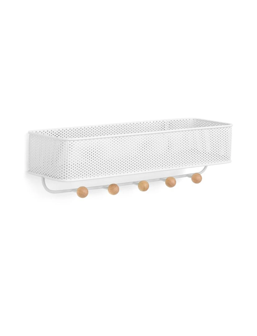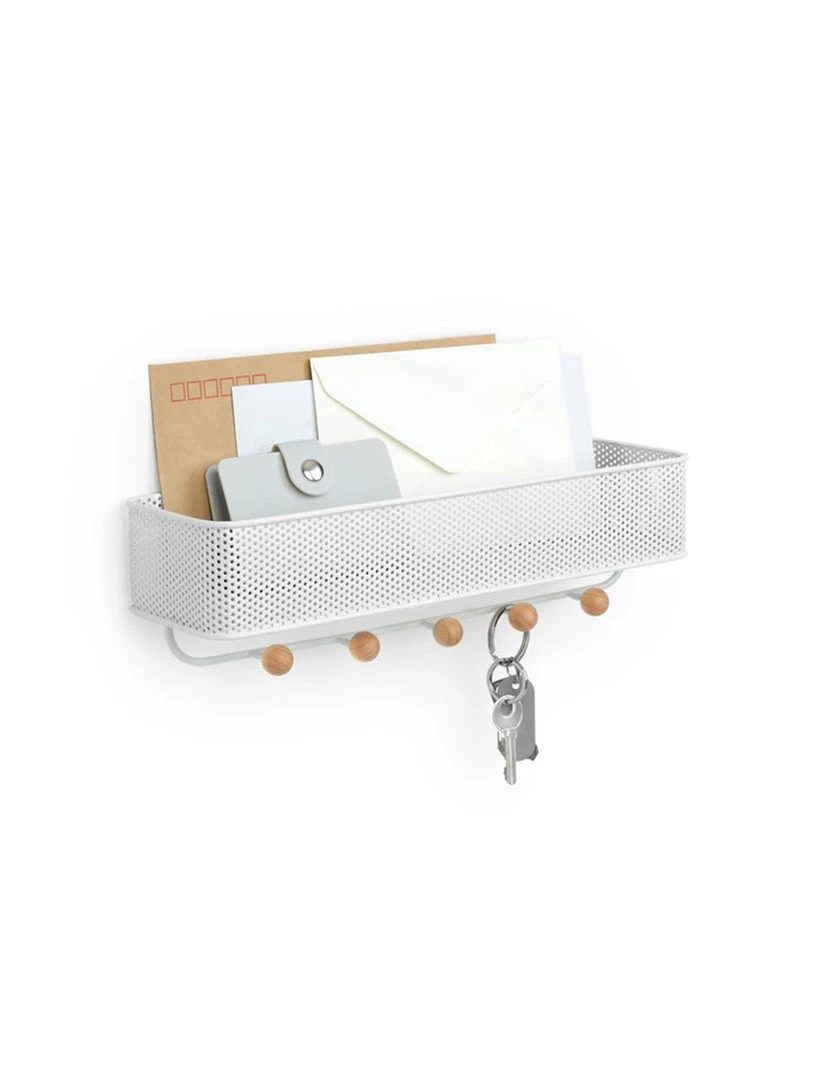 Mystique features a perforated metal basket to store your mail, wallet, cellphone and other small accessories, along with 5 hooks with wooden knobs which are perfect for hanging your keys, lanyards, dog leashes, as well as scarfs, hats and outerwear. Keeping all your belongings in this multipurpose wall-mounted organizer allows you to cluttered your entryway while eliminating the hassle of tirelessly searching your home for that one missing item. Available in a white coated finish, Mystique is suitable for your mudroom, entryway, kitchen, office, studio or wherever you choose to put it. Mystique comes with all the necessary mounting hardware and instructions so setting it up on your wall is super-easy. The mounting hardware is also hidden which makes for a seamless look. Measures 12 ½ x3 ½ inches x 3 ¼ inches, Mystique is the perfect addition to your entryway or living space and helps organize your mail, small accessories and keeps everything you need in one place.