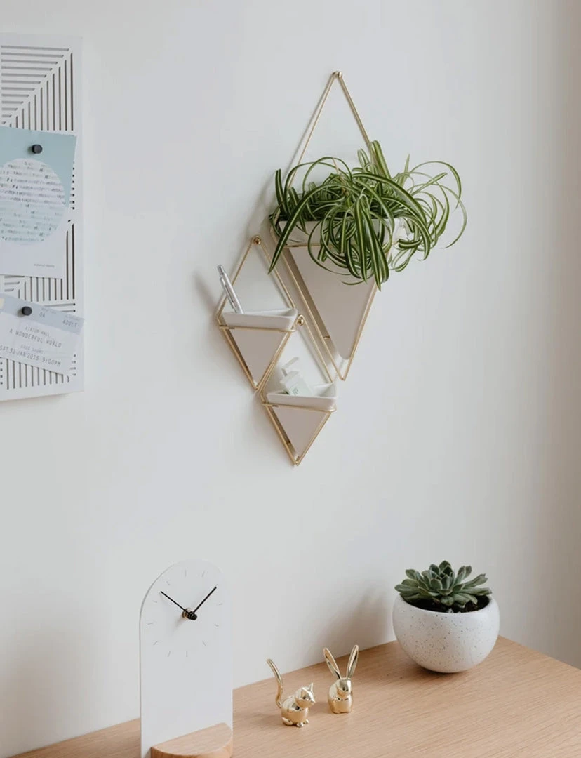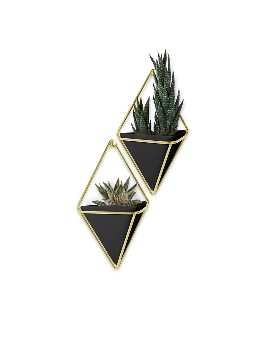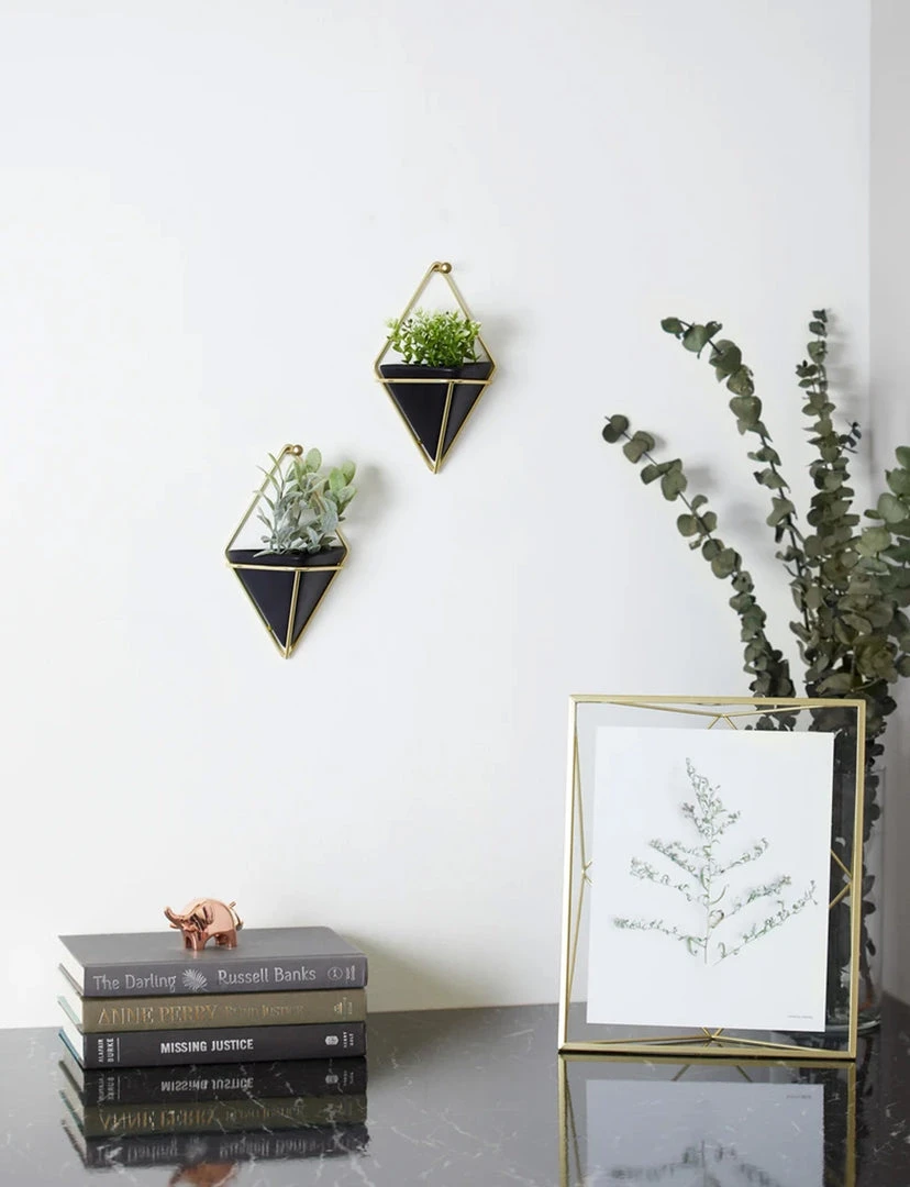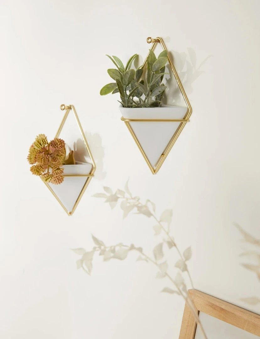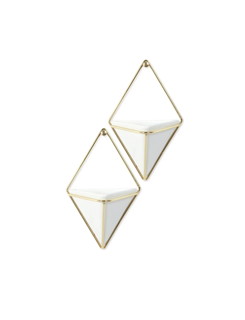 Use Trigg as a planter to add lush greenery to your space, in a stylish, unique fashion. Trigg creates an instant graphic impact, with its sharp, eye-catching diamond wire frame, and sleek finish. The product can safely nestle small succulents, air plants, mini cacti, faux succulents, and faux sedums, in addition to household items like stationary. These small vessels are sold in a set of two and are particularly compelling décor when installed in multiples. Trigg comes in two modern color variations, one, concrete with a copper metal wire frame and the other, white ceramic with a brass wire frame. Trigg comes in two sizes, the smaller one measuring at 4 ¾ x 2 ½ x 7 ½” (12 x 6.4 x 19 cm) and the large at 8 ¾ x 3 ¾ x 15 ¼” (22.2 x 9.5 x 38.7 cm).