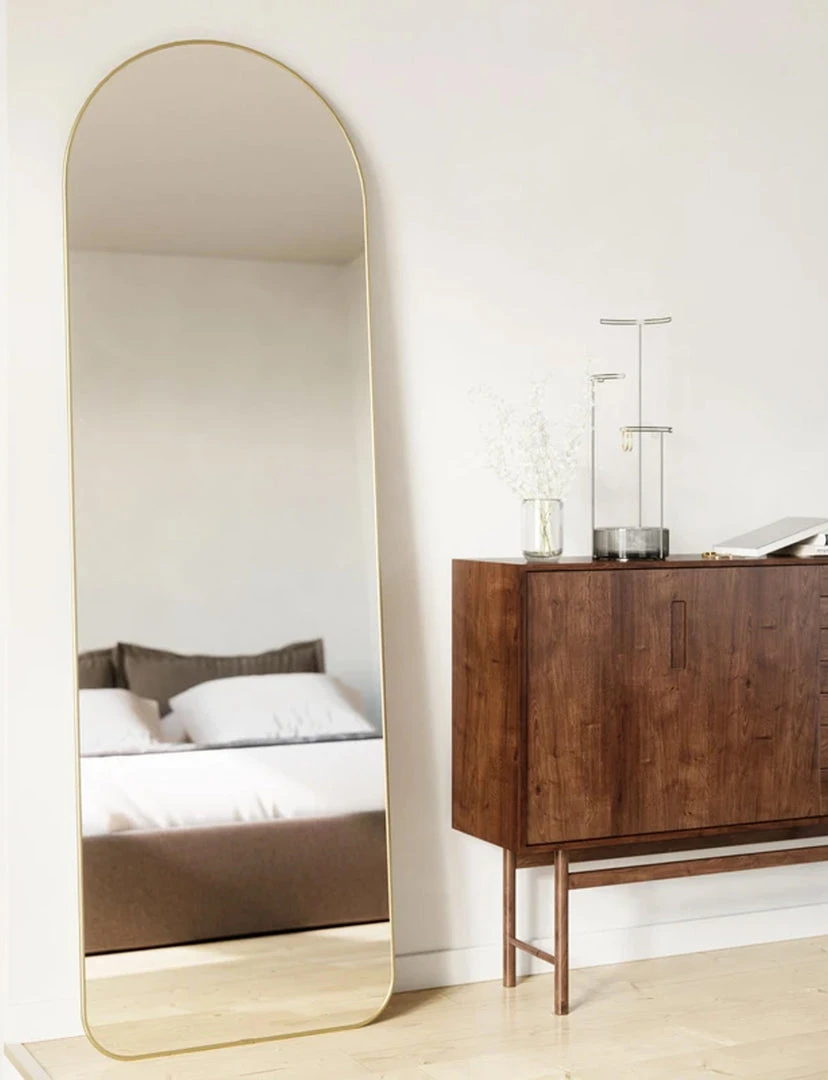 Hubba Arched Leaning Mirror brings a unique arch shape to the standard floor mirror. Featuring soft curves and a thin metallic finish rim, use Hubba in your entryway, bedroom or other living spaces to add a decorative touch, while instantly brightening your space. Measuring, 20 x 62 inches (51 x 157.5 cm), this statement mirror can be leaned up against your wall or mounted with included hardware.