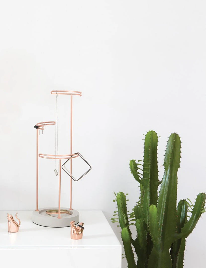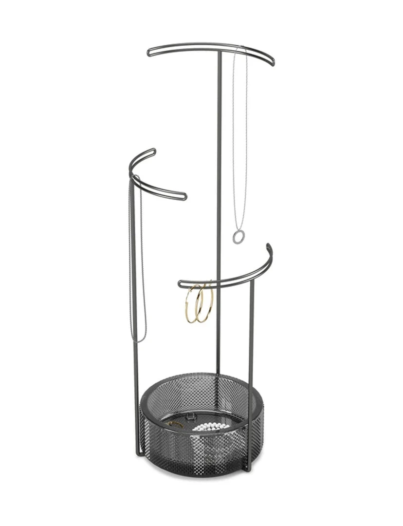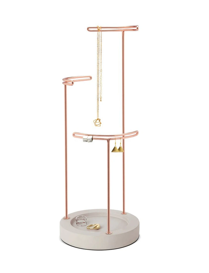 Socrates Jewelry Stand is a contemporary, industrial-inspired jewelry storage device, constructed using raw architectural materials. Socrates is designed with three posts of varying heights to accommodate jewelry of any length. At the base of the tree is a dish, which allows for additional storage of smaller accessories, like earrings and brooches. The stand’s unique double wire detailing on each post makes for a secure display of earrings or cuff-links. Socrates Jewelry Stand measures at 6 ¼ (diameter) x 16 ¼ inches (height) and is an attractive and efficient product to help organize and store your jewelry.