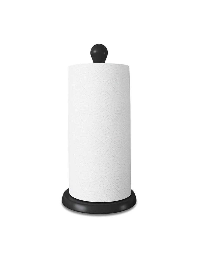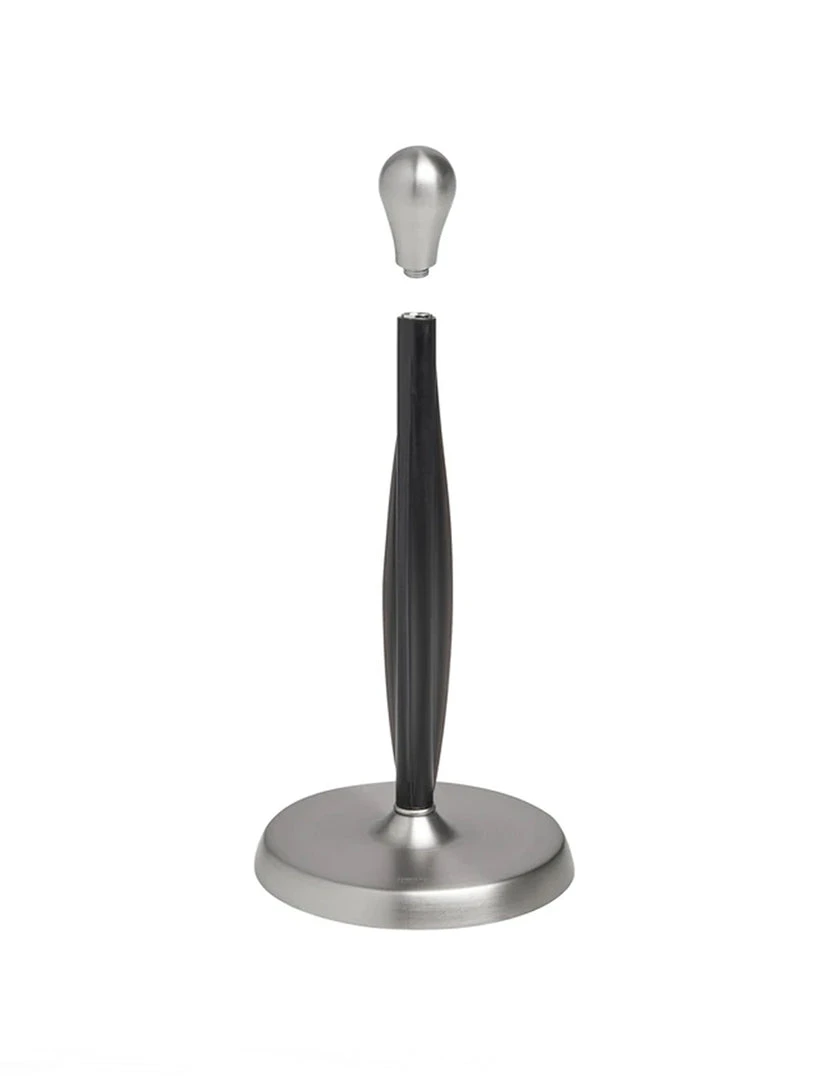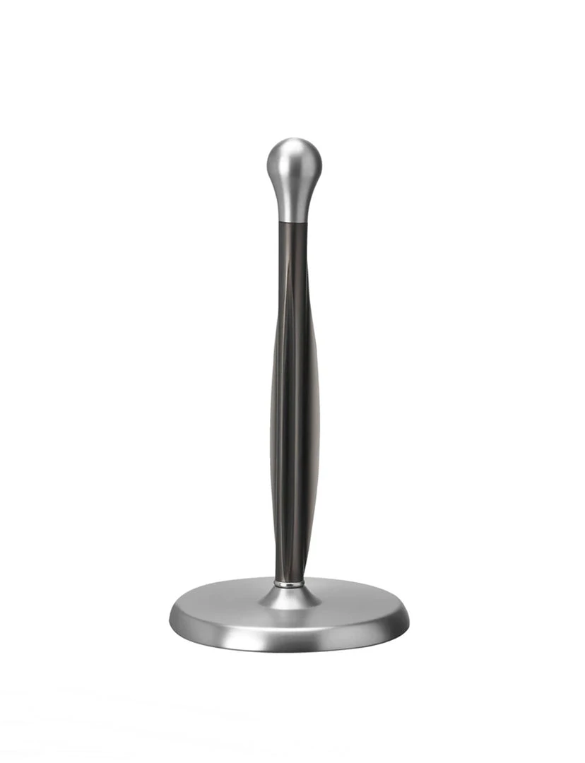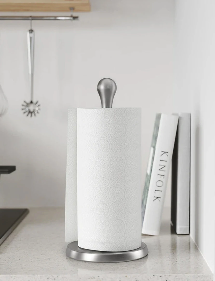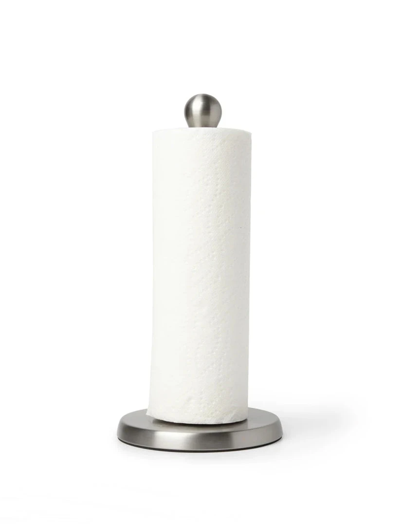 Keep your paper towels easily accessible with Tag Stand Up Paper Towel Holder. Tag features simple, elegant lines and a choice of a modern brushed nickel or copper finish, sure to enhance your kitchen decor. The unique shape of the 13.5-inch curved rubber spine and its molded fins provide the perfect amount of friction to hold the core of any standard size paper towel roll in place, for an easy one-handed tear. To dispense, simply pull back a sheet of paper towel, then give a firm ‘Tag’ from the top down to tear the sheet away along the paper towel perforation. Reloading is painless