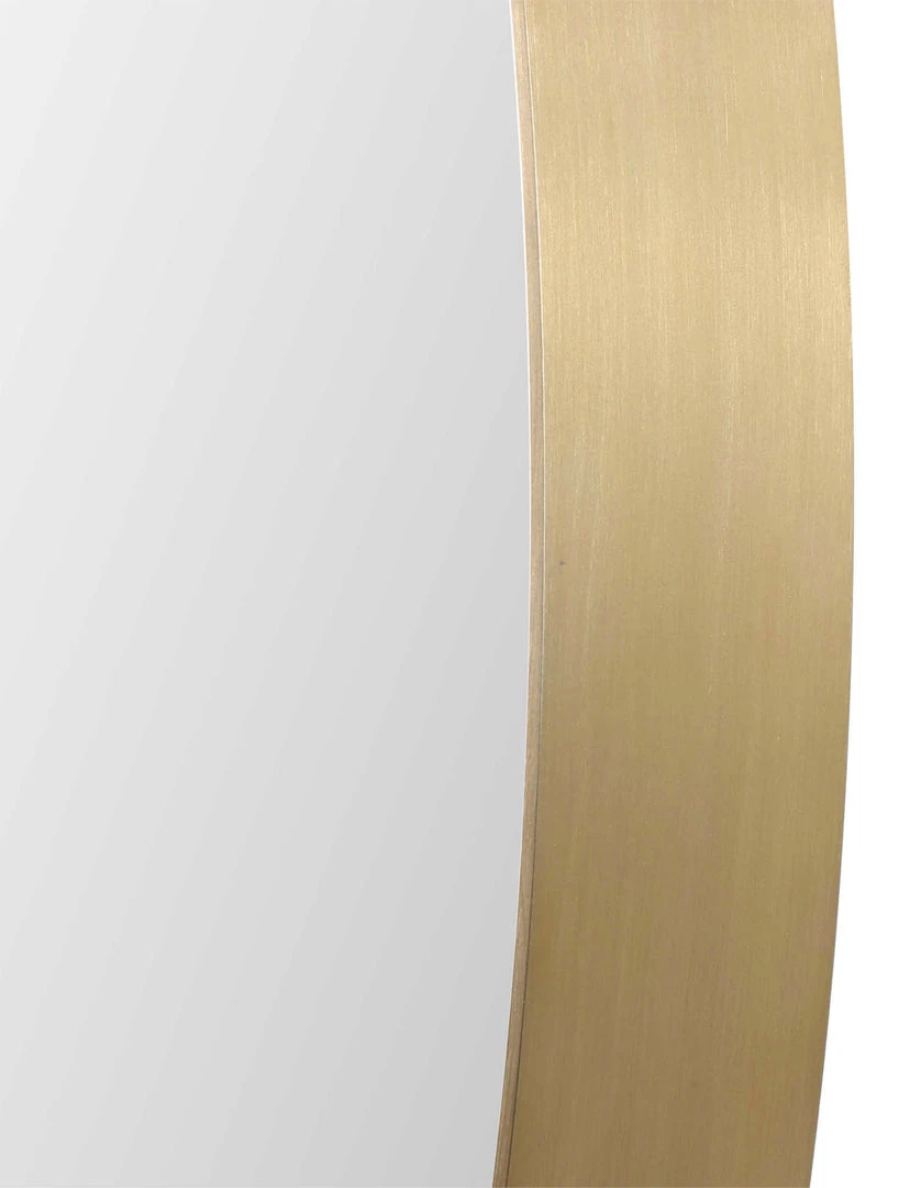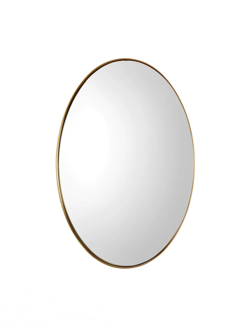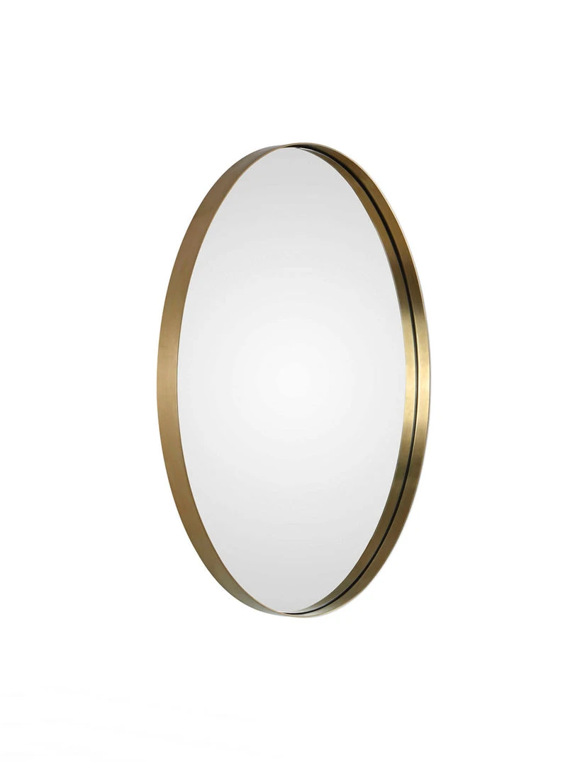 This upscale Dalgahl vanity mirror features a thick steel band displaying nice depth with a plated brass finish. May be hung horizontal or vertical.