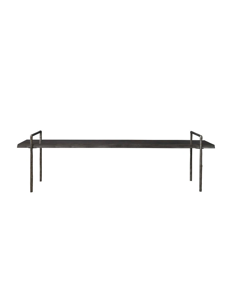 Modern lodge styling, featuring a solid acacia wood seat with a live edge look stained in a dark gray with an organically textured iron frame finished in tarnished silver.
