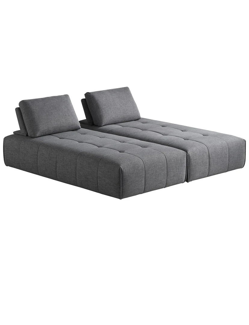 Use your creative spirit to configure this sectional to fit your needs and unique space. Two-piece modular sectional sofa set with square-tufted tight seat and movable backrests in gray fabric. Backrests are boxed waterfall design. Includes two bolster and knife edge pillow combinations that can be used as headrests. Four wood legs in medium brown color on each section.
