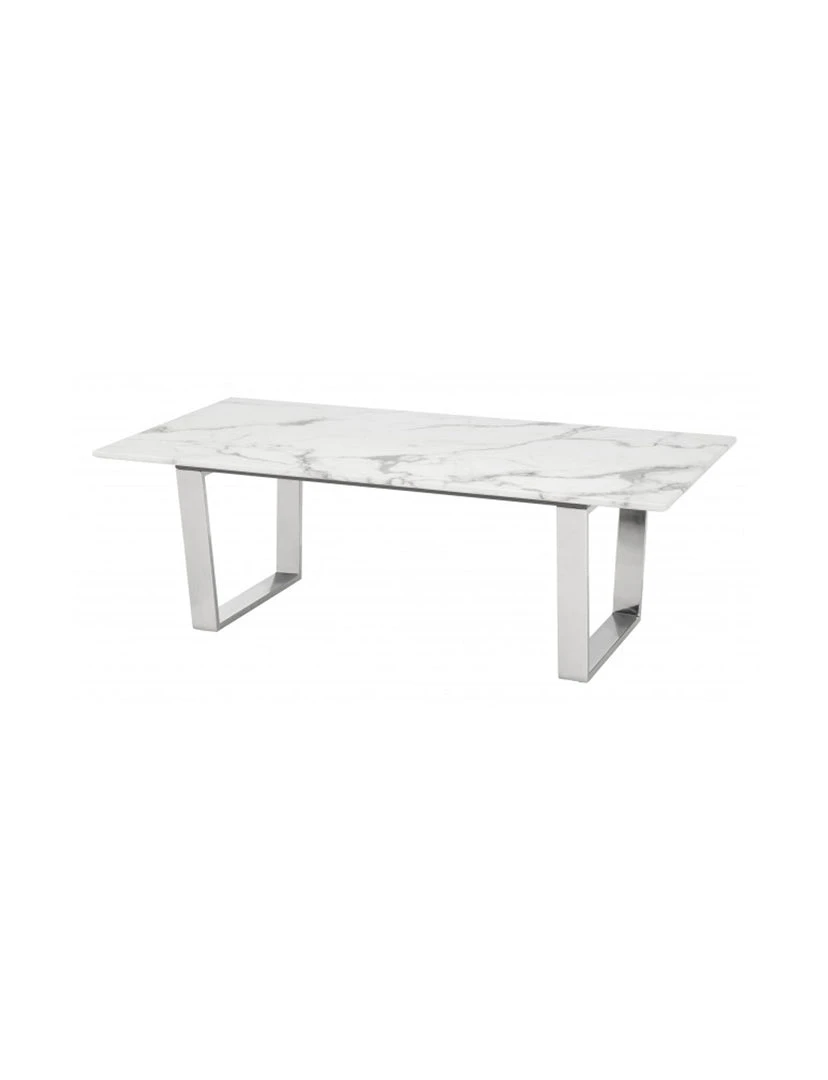 On-trend and decidedly modern, this sophisticated coffee table will be on every designers list. The rectangular faux marble top seems to float atop its simple gold geometric base and is gorgeous from every angle. Perfect in front of your sofa and is long and narrow to fit in most spaces. Pair with the Atlanta console and end table.