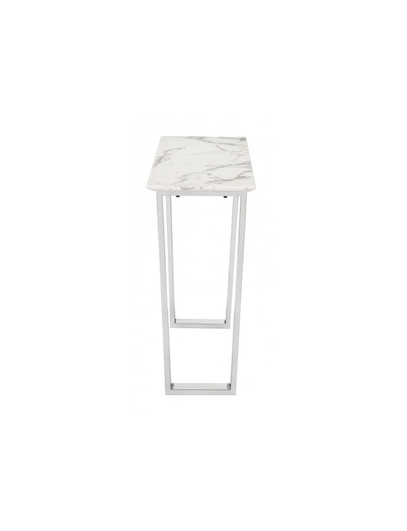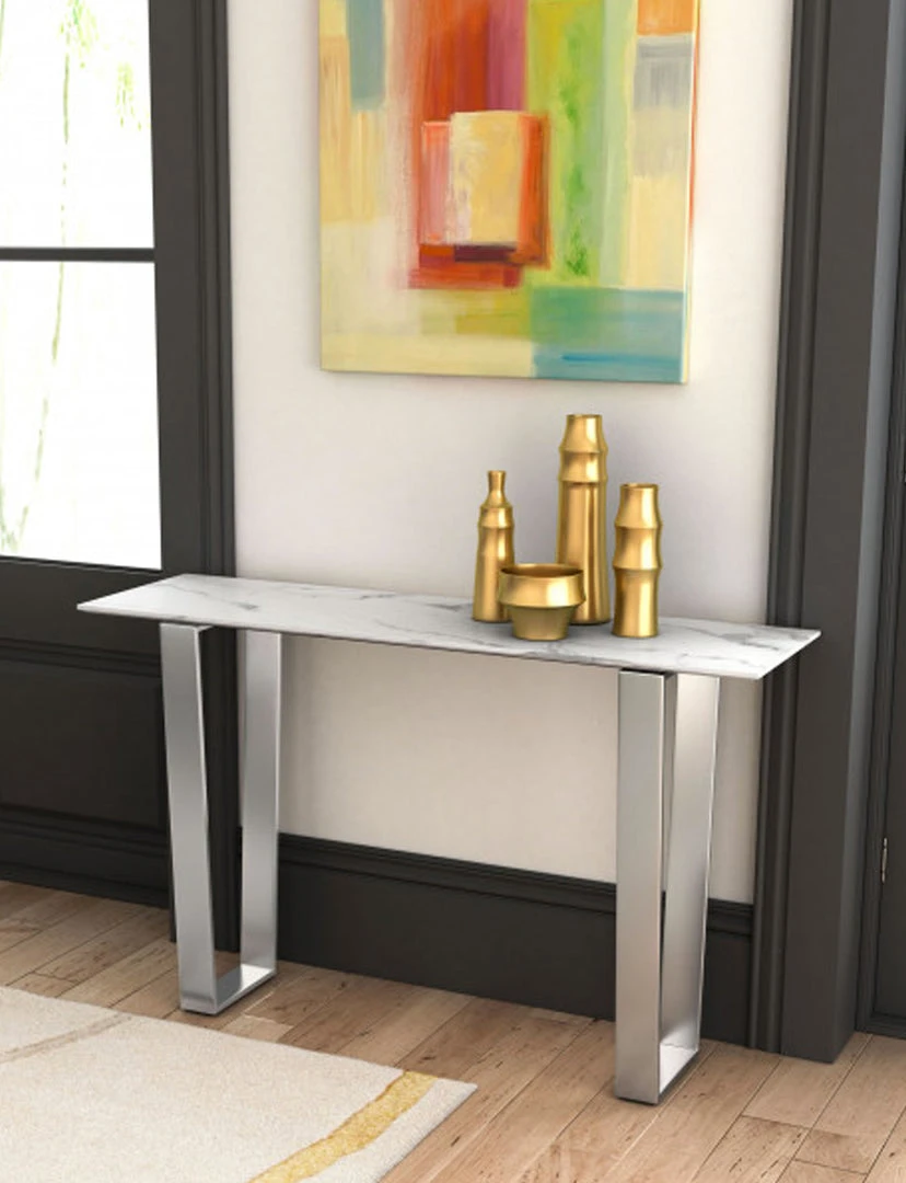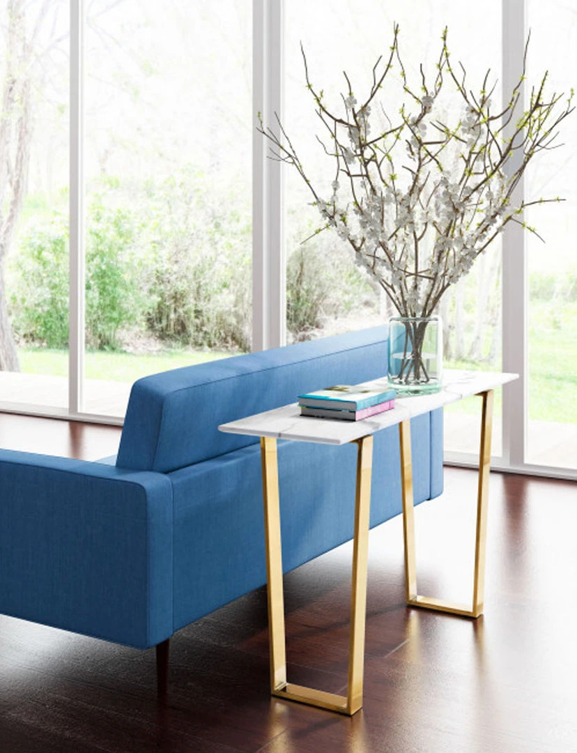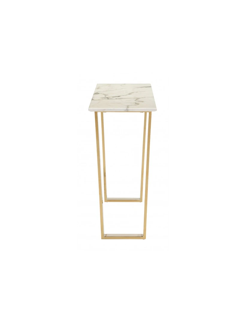 On-trend and decidedly modern, this beautiful console table will be on every designers list. Gorgeous from every angle, the rectangular faux marble top seems to float atop its simple gold geometric base. Long and narrow to fit in most spaces and is perfect for your entry, dining or living space.