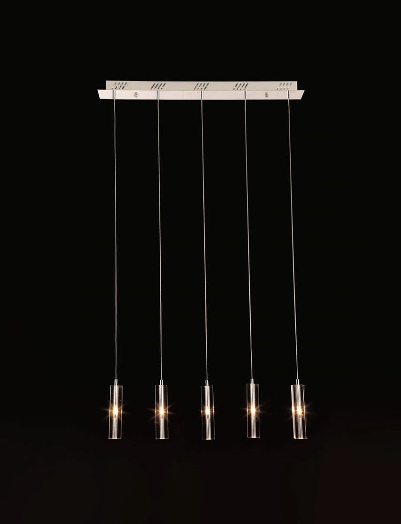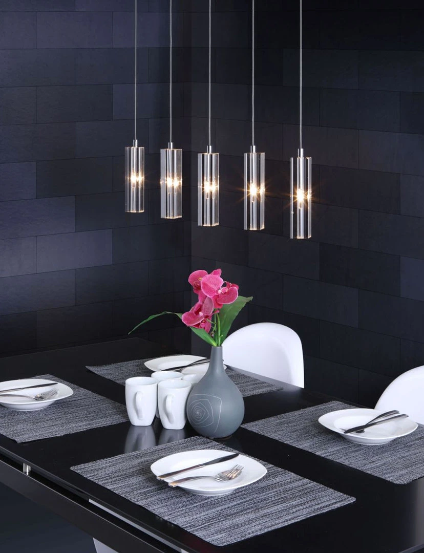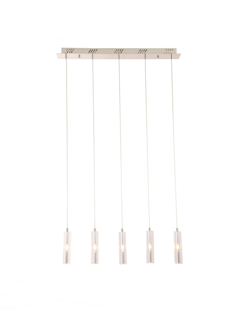 Five distinct hanging bulbs cast a sophisticated glow. The Crea Ceiling Lamp has a chrome body and sleek halogen lights to brighten up any room. 5 x 20 W G4 Type Halogen Type G4. UL approved and listed. Bulbs are included.